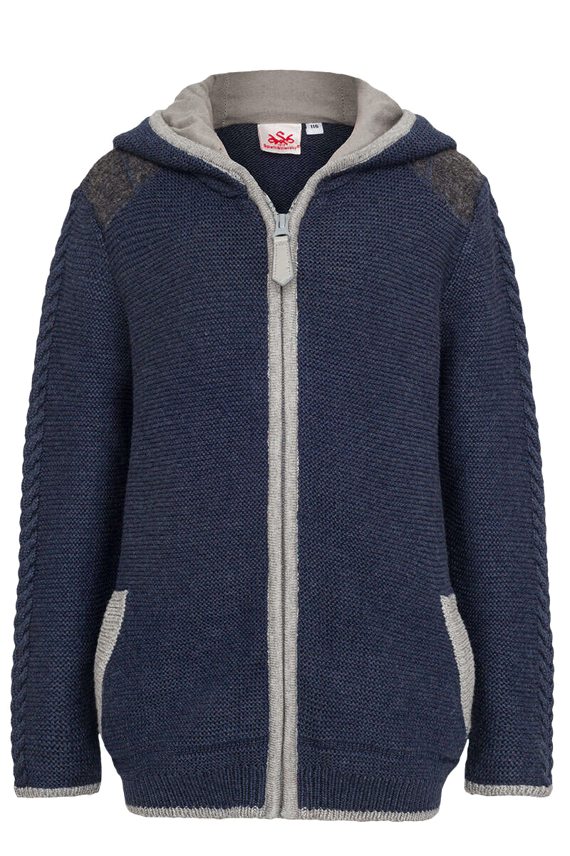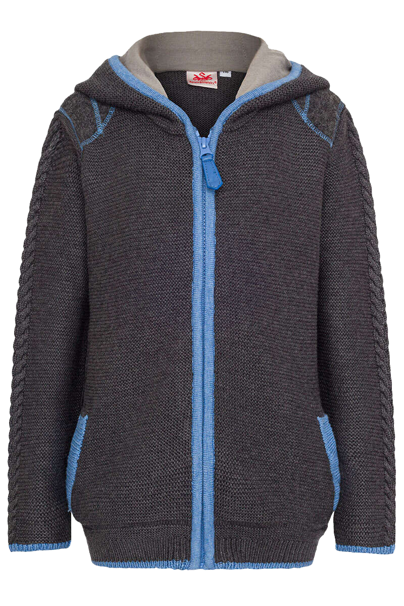Die modische dunkelgraue Kapuzen-Strickjacke SPECHT KIDS der Marke Spieth&Wensky ist mit vielen coolen und trachtigen Details ausgestattet. In die mit linken Maschen gestrickte Kinderjacke ist oben am Ärmel ein schönes Zopf-Strickmuster eingearbeitet. Auch unten am Bund wechselt das Strickmuster, und zwar vom Links-Strick zu gestrickten Ripp-Bündchen. Die Abschlüsse an den Ärmeln und am Bund sind mit heller blauer Wolle kontrastreich eingefasst. Auch die praktischen Taschen haben einen Eingriff in dieser Kontrastfarbe. Entlang des Reißverschlusses und der Kapuze ist ein Feinstrick-Streifen im gleichen hellen Blauton angebracht.Die lässigen Ellenbogen-Patches und Schulter-Aufsätze sind, genau wie das Hirschgeweih auf dem Rücken, aus dunkelgrauem Walk gefertigt und mit einer blauen Ziernaht angebracht. Die Kapuze besitzt ebenso blaue Ziernähte und ein weiches Jerseyfutter.