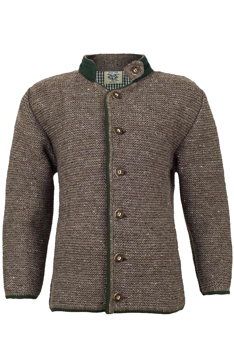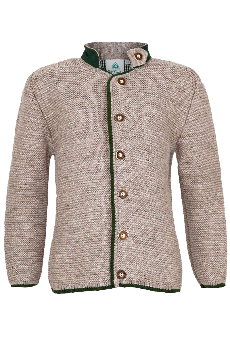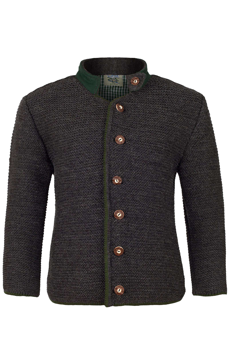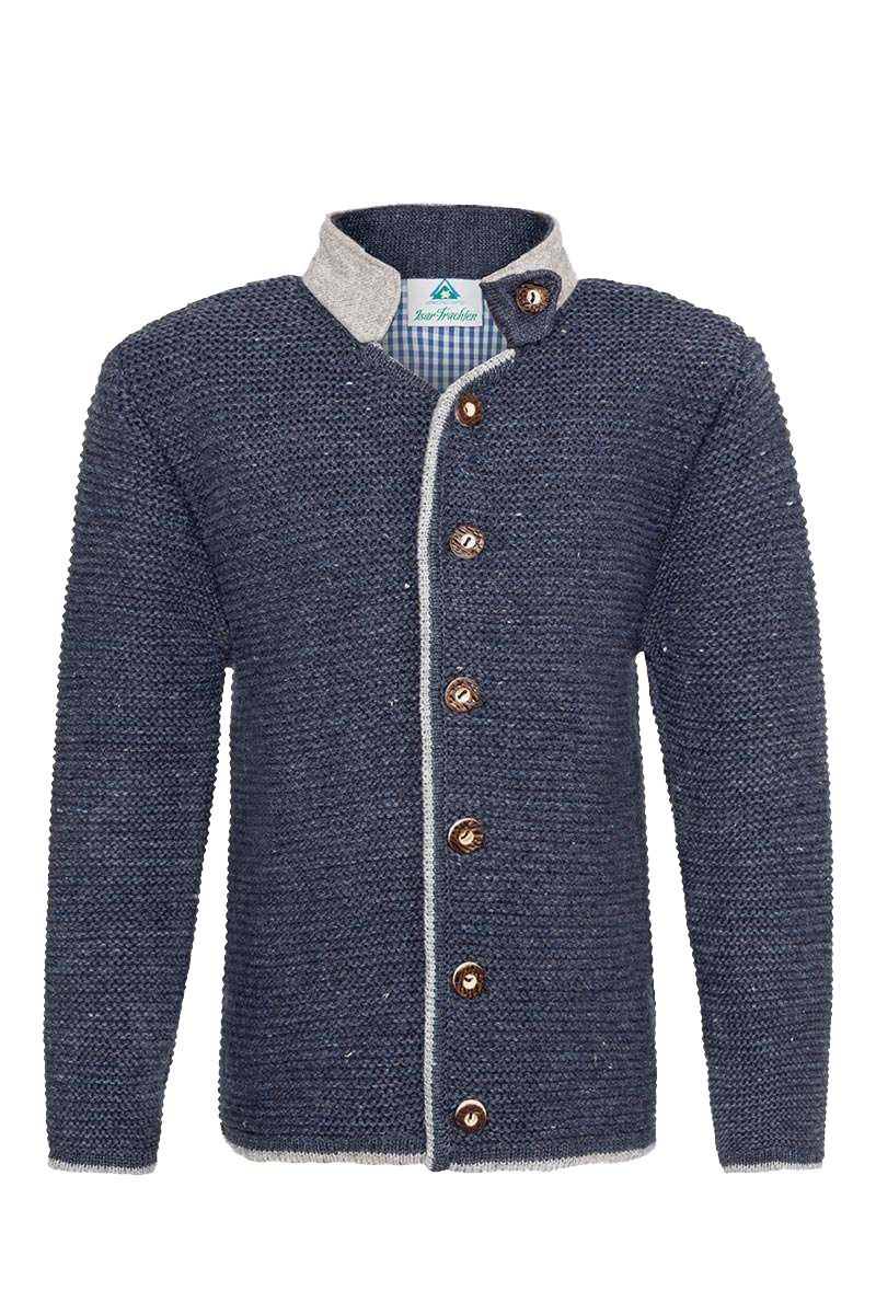 Diese fesche Trachten-Strickjacke der Marke Isar Trachten ist schlicht und traditionell gehalten. Die Abschlüsse der jeans farbenen, linksgestrickten Jacke sind in einem hellen Grau abgesetzt. Auch der Stehkragen ist grau gehalten. Die Jacke wird vorne mit kleinen, Knöpfen in Hirschhornoptik geschlossen. Sie ist mit einem Stehkragen ausgestattet.