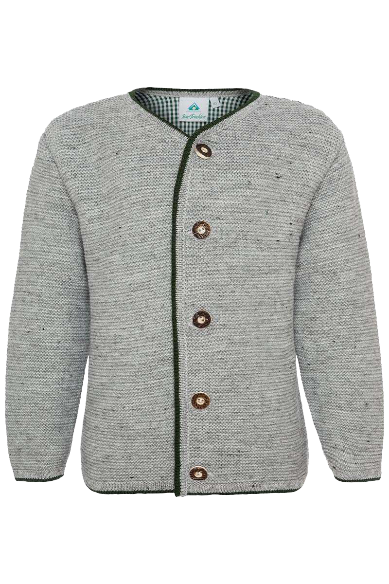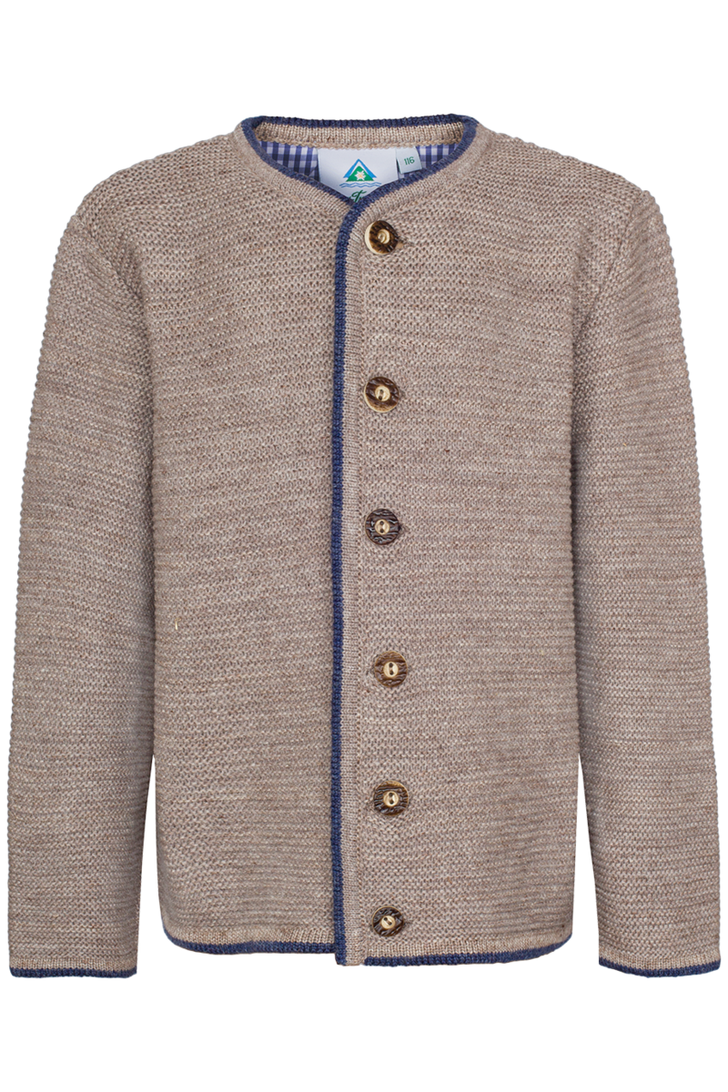 Die beige (berber) Kinder-Strickjacke von Isar-Trachten ist ein perfektes Kleidungsstück für den jungen Trachtler. Mit den dunklen Knöpfen in Hornoptik und dem blauen Saum an den Abschlüssen verfügt sie über klassische Trachtenmerkmale. Am Rundkragen ist sie mit einem blau-weißen Karo-Einsatz ausgestattet.