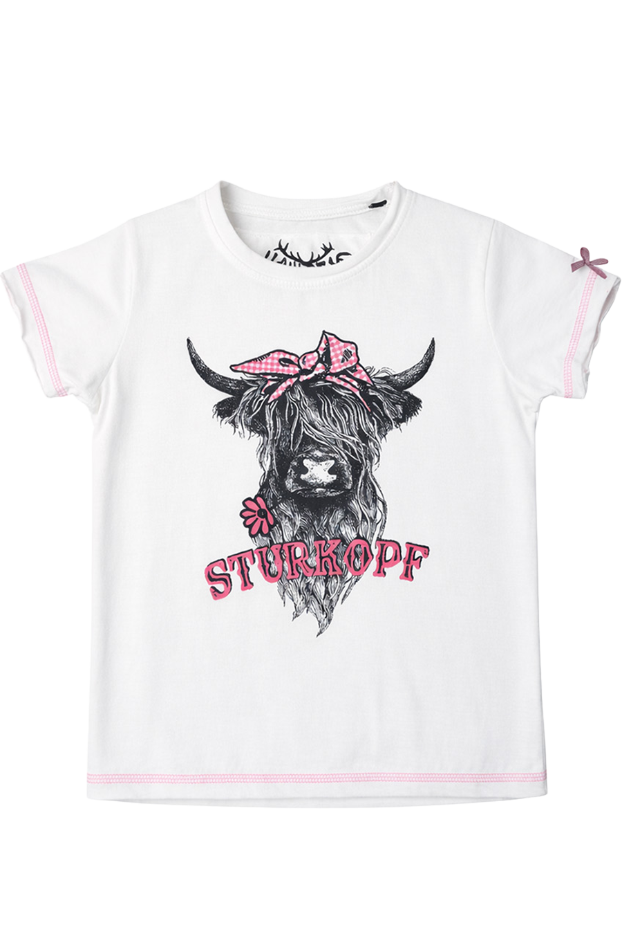 Im Mittelpunkt steht der liebevoll gestaltete Hochlandrind-Print: Mit einer süßen Schleife im Haar, einer Blume im Maul und einem farblich abgestimmten Schriftzug 'Sturkopf' entsteht ein fröhlicher, verspielter Look, der sofort ins Auge fällt.