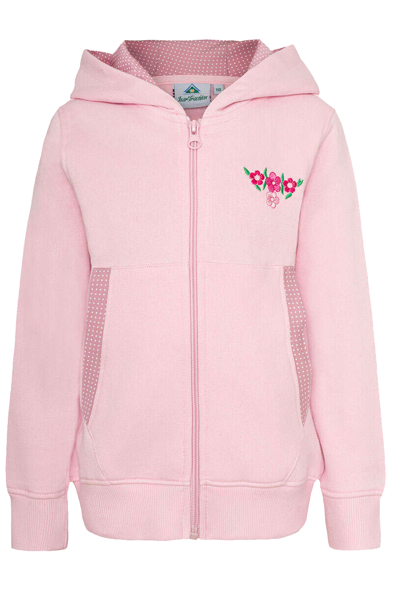 Eine süße Sweatjacke mit Kapuze und Reißverschluss in rosa für kleine Trachtenfans von Isar Trachten. Die Jacke ist aus angenehm zu tragendem, weichen Sweatstoff, der innen besonders kuschlig verarbeitet ist. Der Abschluss der Känguruh-Taschen und das Innenfutter der Kapuze sind aus rosa-weißen Tüpfchenstoff . Auf der linken Brust ist eine süße Blümchen-Stickerei in rosa, pink und grün angebracht. Auf dem Rücken befindet sich eine größere Stickerei mit dem Kopf einer hübschen Hirschdame, verziert mit Blumenranken in pink, rosa und grün. Aus 100% Baumwolle mit OEKO-TEX-Standart 100.