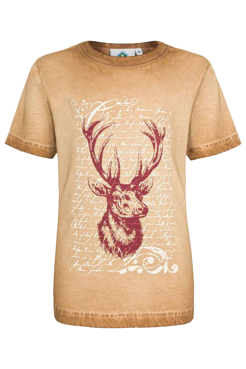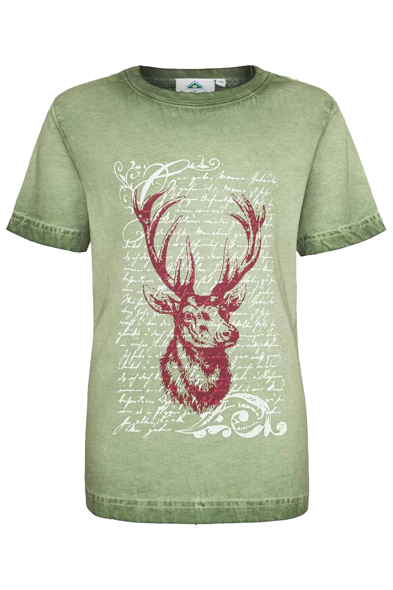 Dieses coole Baumwollshirt von Isar-Trachten in olivgrün ergänzt den Trachtenlook Ihres Buben. Die spezielle Färbung macht das Hemd einzigartig, an den Ärmelenden und am Saum ist die Waschung etwas dunkler. Das großflächige Motiv eines braunen Hirschkopfes ziert stolz die Vorderseite. Ein heller Schriftzug und ein dekoratives Muster bilden den Hintergrund.Das hochwertige Baumwollmaterial ist besonders angenehm zu tragen, da es sehr temperaturausgleichend und atmungsaktiv ist.Die Rückenlänge in Größe 116 beträgt 48 cm.