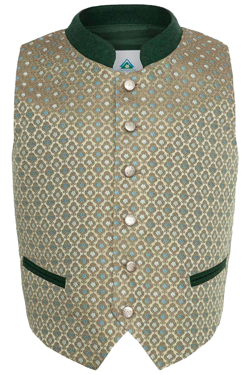 Eine fesche Trachten-Weste in Grün für Knaben von Isar-Trachten. Die Front weist ein festliches Brokatmuster mit kleinen Blüten auf, zu dem der dunkelgrüne Samt an Stehkragen und Taschensaum einen markanten Kontrast bilden. Besonders fesch sind auch die runden Metallknöpfe im antiken Design. Die rundum dunkelgrün gefütterte Weste ist am Rücken in schlichtem Dunkelgrün gehalten.