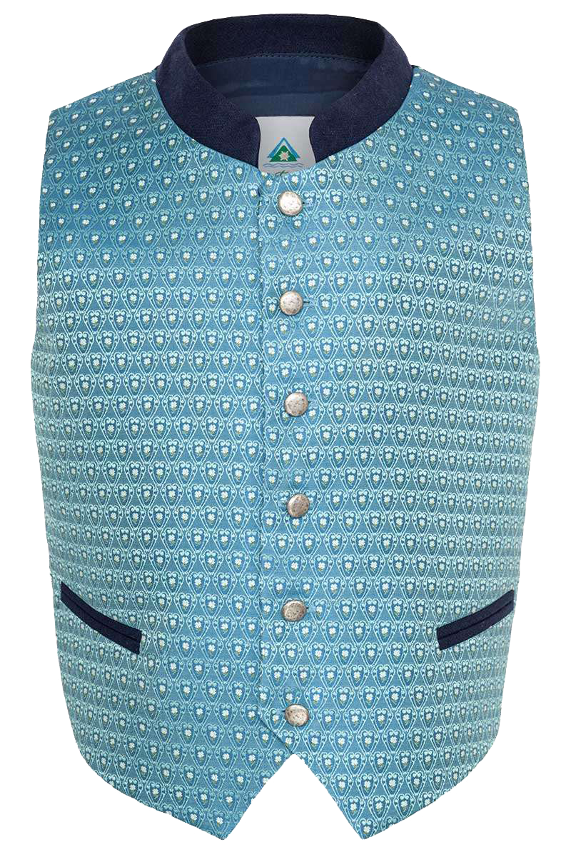 Eine fesche Trachten-Weste in Blau für Knaben von Isar-Trachten. Die Front weist ein festliches Brokatmuster mit kleinen Blüten auf, zu dem der dunkelblaue Samt an Stehkragen und Taschensaum einen markanten Kontrast bilden. Besonders fesch sind auch die runden Metallknöpfe im antiken Design. Die rundum dunkelblau gefütterte Weste ist am Rücken in schlichtem Dunkelblau gehalten.