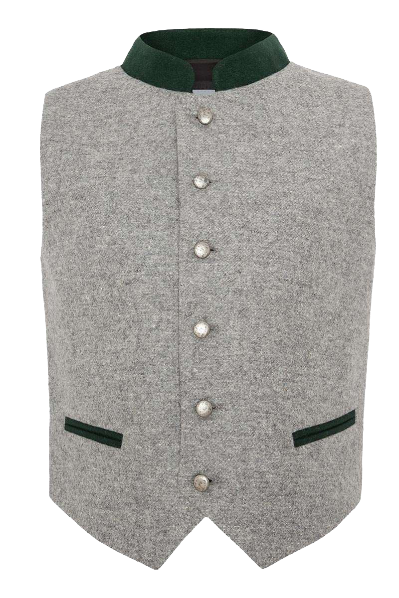 Fesche graue Trachtenweste für Knaben. Der dunkelgrüne Stoff am hoch geschlossenen Stehkragen und den beidseitigen Westentaschen setzt sich kontrastreich vom hellen Grau der Front ab. Die Knopfleiste besteht aus silberfarbenen Metallknöpfen. Der Rücken und die Innenseite sind aus unifarbenem, dunklem Futterstoff. Die Weste lässt sich vielfältig mit Trachtenkleidung ebenso wie mit Jeans und Hemd kombinieren.