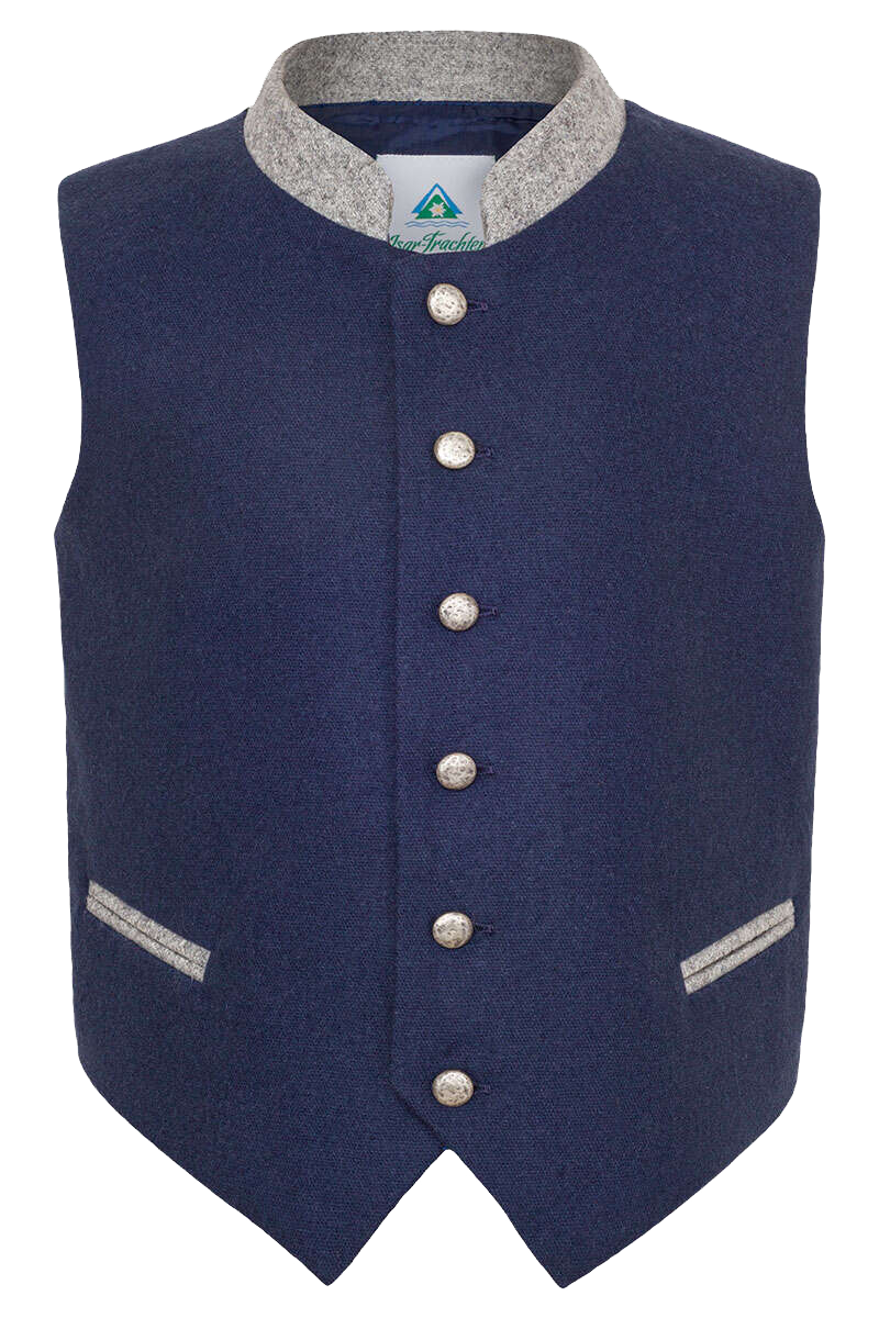 Eine festliche Trachten-Weste aus feinem Loden mit Kaschmiranteil für Buben von Isar-Trachten. Zu der Front in ruhigem dunkelblau bildet der hellgraue Lodenstoff an Stehkragen und Taschensaum einen schönen Kontrast. Besonders fesch sind auch die runden Metallknöpfe in antikem gehämmerten Design. Die Weste ist rundum gleichfarbig dunkelblau gefüttert und hat einen Rücken aus edel schimmerndem marineblauem Stoff.