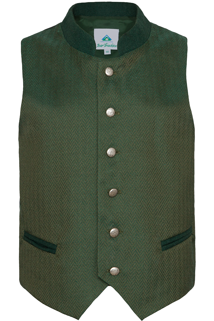 Diese festliche Weste überzeugt mit einem edlen Fischgrätmuster auf der Vorderseite und einem schimmernden Rücken – für einen rundum stilvollen Auftritt. Der Stehkragen und die Taschen sind mit feinem, tonigem Samt verziert und verleihen der Weste einen besonders hochwertigen Look. Die antik wirkenden Metallknöpfe machen den Auftritt extra fesch. Komplett gefüttert, sorgt sie für hohen Tragekomfort – ideal für Volksfeste, Familienfeste oder den großen Auftritt am Trachtenfest.