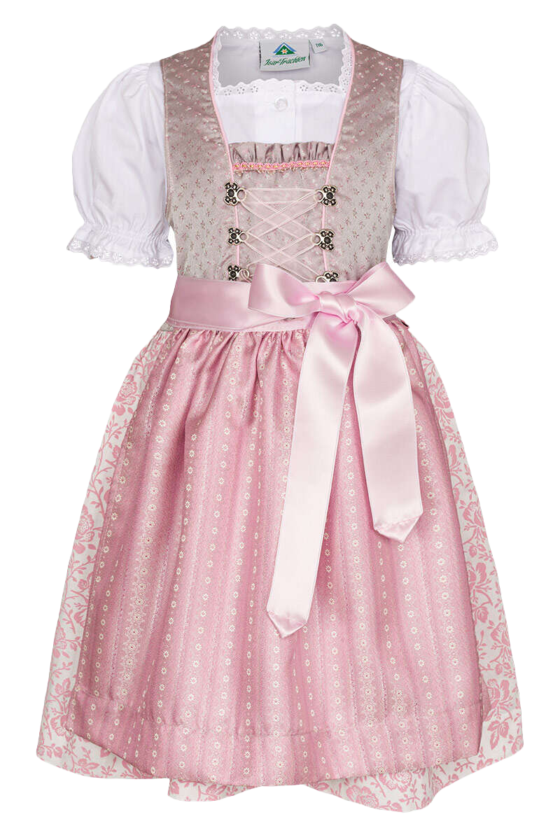 Dieses zauberhafte Kinderdirndl in schimmernden Rosa- und Beigetönen von Isar-Trachten ist ein bezauberndes Dirndl mit liebevollen Details. Zur Zierde ist es auf der Vorderseite mit einer Miederschnürung versehen und wird auf der Rückseite praktisch mit einem Reißverschluss geschlossen.Die Metallösen der Miederschnürung sind wie hübsche Blumen gestaltet. Der Ausschnitt ist hübsch mit Rüschen und einer Borte verziert. Das Oberteil hat ein verspieltes Blümchenmuster, der Rock aus reiner Baumwolle ist mit einem großen Blumenmuster in rosa verziert.Die rosa Schürze aus schimmerndem Stoff hat ein zartes Blumenrankenmuster mit hellen Akzenten. Als Schürzenband dient ein schönes Satinband.Eine weiße Bluse mit kurzen Ärmeln wird mitgeliefert. Sie ist am hochgeschlossenen Ausschnitt mit einer Spitzenborte verziert und an den Ärmeln mit einem Gummizug versehen, damit sie perfekt sitzt.Mit diesem hübschen Kinderdirndl von Krüger werden Prinzessinnenträume wahr. Die Farbkombination wirkt besonders edel und ist perfekt für festliche Anlässe.Die Rocklänge in Größe 116 beträgt ca. 41 cm.