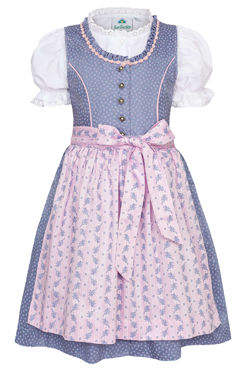 Mit dem zauberhaften hellblauen Kinderdirndl von Isar-Trachten und der weißen Bluse mit Puffärmelchen sind kleine Trachtlerinnen immer perfekt gekleidet. Die Bluse ist an den Ärmeln und am Ausschnitt mit einer Spitzenborte verziert. Das Dirndl wird mit schönen Kugelknöpfen aus Metall geschlossen und ist am Ausschnitt mit einer kleinen rosa Borte und Rüschen verziert. Oberteil und Rock sind aus einem hellblauen Stoff mit kleinem Blümchenmuster gefertigt. Die rosa Schürze besitzt ein hübsches florales Streifenmuster in weiss und blau.
