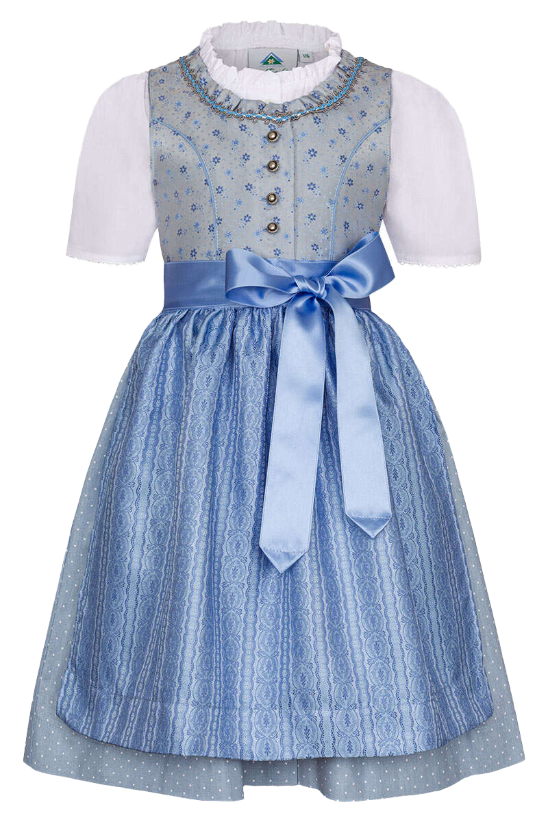 Dieses wunderschöne Kinder-Dirndl der Marke Isar-Trachten ist inklusive Bluse in zarten Blautönen gefertigt und macht aus Ihrer kleinen Maus schon in jungen Jahren ein richtig fesches Trachten-Madl.Die hochwertige Bortenverzierung rund um den Halsausschnitt, die traditionellen altsilberfarbenen Knöpfe und die schicke blaue Paspelierung entlang des Brustabnähers zeigen schon auf den ersten Blick die hohe Verarbeitungsqualität dieses Dirndls. Oberteil und Schürze sind sogar aus echtem Jacquard-Stoff gewebt und zeigen daher ein durch die Webart changierendes Muster. Der Rock ist aus reiner Baumwolle und somit eine reine Naturfaser. Ganz bestimmt wird Ihnen das Herz aufgehen, wenn Sie Ihre Tochter oder Ihr Enkelkind in diesem schicken Dirndl sehen - schon ganz wie die Großen.Die Rocklänge beträgt in Größe 116 ca. 38 cm.