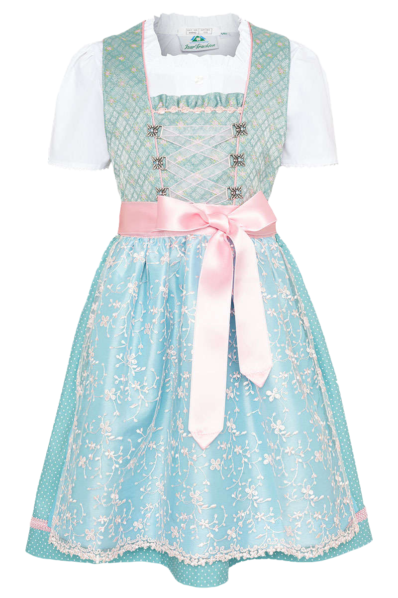 Das türkisfarbene Mädchendirndl von Isar Trachten hebt sich durch ein besonders hübsch und hochwertig gestaltetes Mieder mit Schnürung hervor. In den türkisfarbenen Grundton ist ein zartes Blütenmuster eingewebt. Der Rock mit Pünktchenmuster wird von einer rosa Borte gesäumt. Das transparente cremefarbene Oberteil der Schürze ist von einem unifarbenen Unterteil in Türkis unterlegt. Geöffnet wird das Kleid durch einen Reißverschluss am Rücken. Zum Lieferumfang gehört die weiße Kurzarm-Bluse. Während Oberteil und Schürze aus Polyester hergestellt sind, besteht der Rock aus Baumwolle.