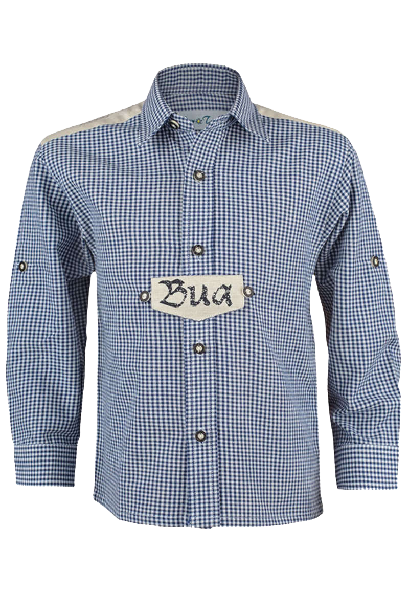 Trachtiges blau-weiß kariertes Kinder-Hemd.Dieses Hemd ist die richtige Bekleidung für jeden kleinen Trachtenfan. Ins Auge sticht der kleine, mit Hirschhornknöpfen angebrachte beige Latz mit dem Print "Bua" auf der Vorderseite des Hemdes. Der Schultersattel ist ebenfalls in beige gehalten und mit dem Print ""Trachten Bua"" sowie ein paar ausgedünnten blauen Streifen in Printform versehen. Die Knopfleiste des Hemdes, sowie die Ärmelmanschette und die Ärmel, sind mit Knöpfen in Hirschhornoptik versehen.