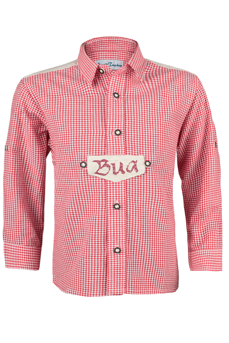Trachtiges rot-weiß kariertes Kinder-Hemd.Dieses Hemd ist die richtige Bekleidung für jeden kleinen Trachtenfan. Ins Auge sticht der kleine, mit Hirschhornknöpfen angebrachte beige Latz mit dem Print "Bua"" auf der Vorderseite des Hemdes. Der Schultersattel ist ebenfalls in beige gehalten und mit dem Print "Trachten Bua" sowie ein paar ausgedünnten roten Streifen in Printform versehen. Die Knopfleiste des Hemdes, sowie die Ärmelmanschette und die Ärmel, sind mit Knöpfen in Hirschhornoptik versehen.