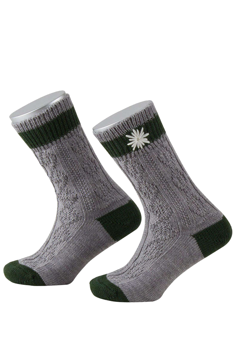Sehr schöne Kinder Schurwollsocke mit verstärkter Ferse und Spitze. Blickfang ist sicherlich das gestrickte Rautenmuster sowie das bestickte Edelweiß am Bund. Durch den 70% Schurwollanteil werden die Füße schön warm gehalten und fühlen sich auf der Haut angenehm weich an.