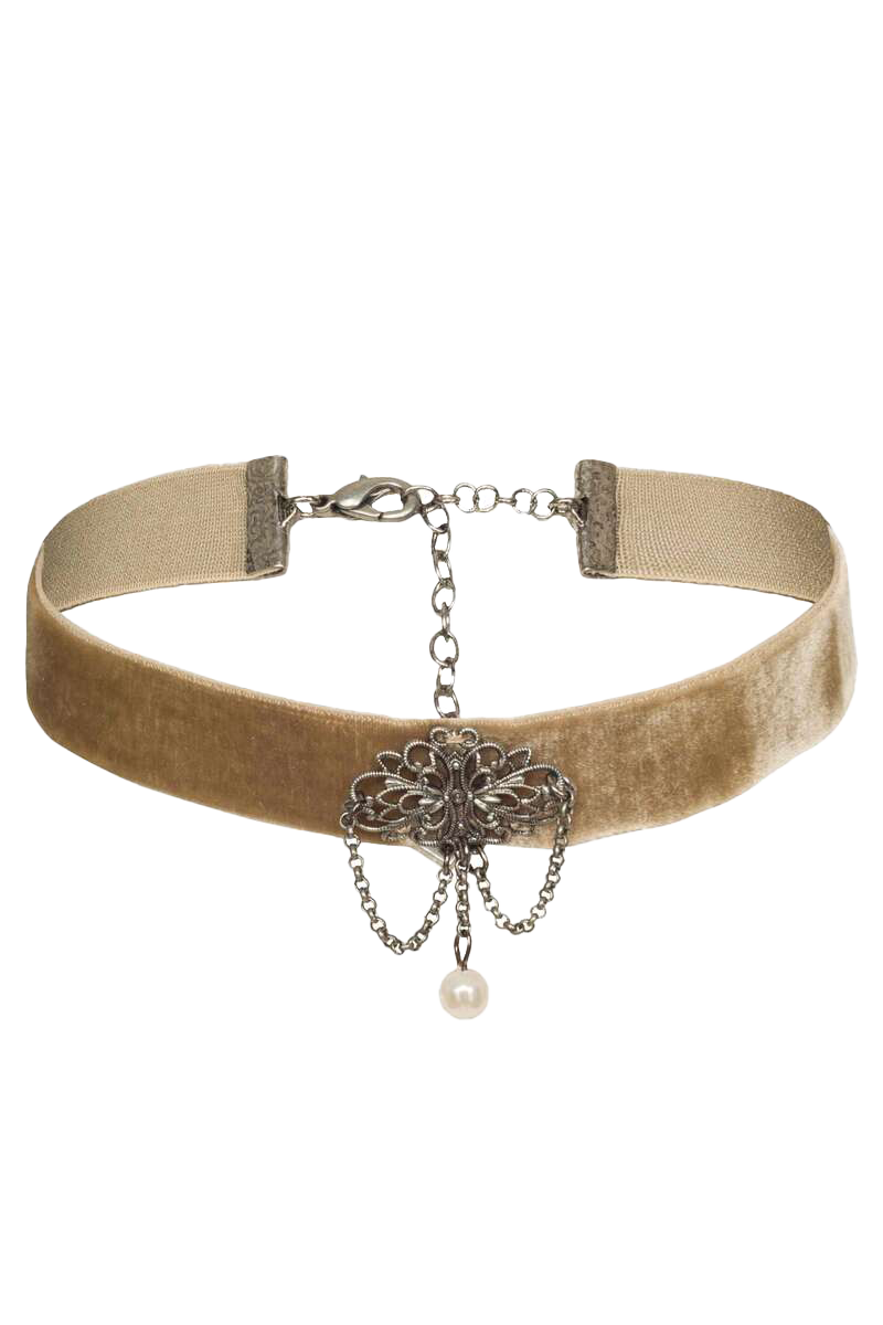 Dieses beige Kropfband von Silkdrops ist die perfekte Ergänzung zum Dirndl oder zur Lederhose. Das ca. 1,5 cm breite Band aus Samt ist mit einem Stretch-Anteil versehen und passt sich so perfekt an. In der Mitte ziert es ein altsilberfarbenes Schmuckelement in hübscher Blütenform, an dem zwei feingliedrige Ketten und ein Anhänger in Perlenoptik befestigt sind. Die enganliegende Halskette mit Karabinerverschluss ist ca. 28 cm lang und kann um 6 cm verlängert werden.