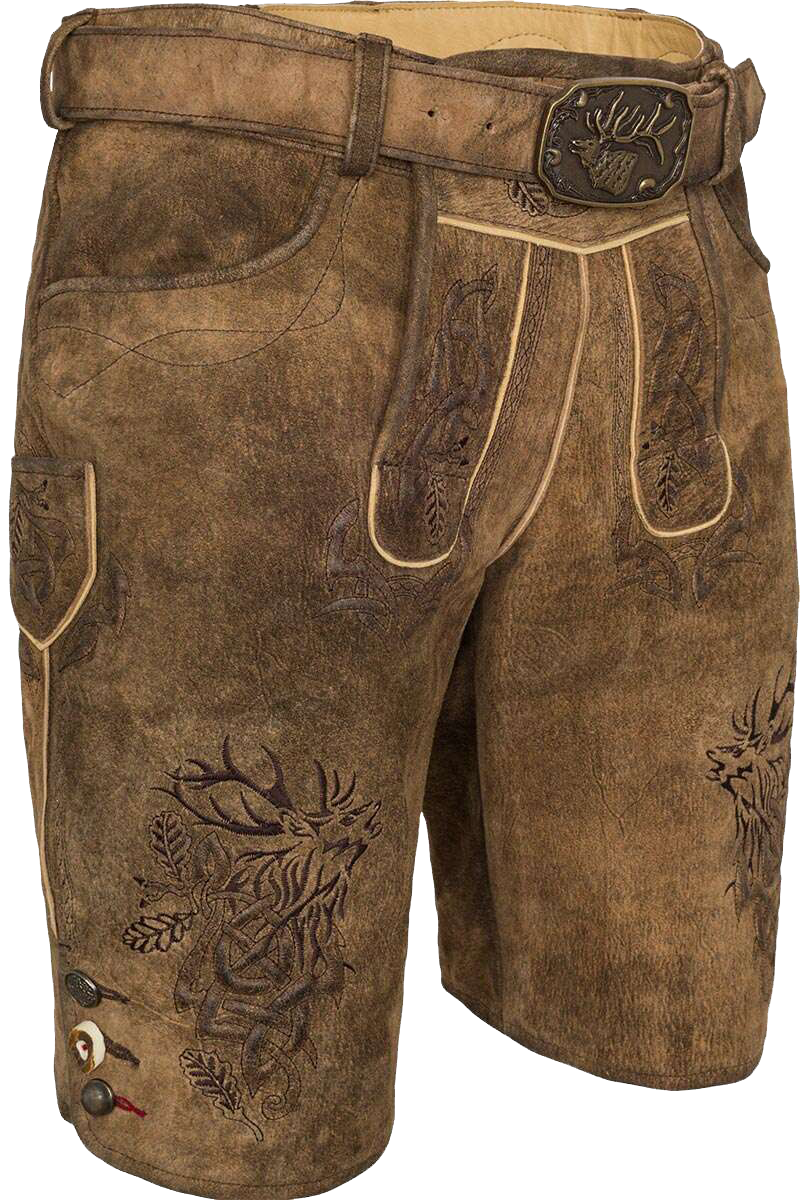 NERCEL von der Marke Spieth & Wensky ist eine mandel-farbene kurze Herren Lederhose mit zahlreichen aufwendigen Stickerein aus trendigen Tribal-Ornamenten (erhaben), Hirschköpfen, Eichenblättern und Ziernähten aus schwarzem Garn. Sie besitzt einen klassischen Schnitt mit Hosenlatz, zwei Einschubtaschen vorne, Gesäßtasche, Tellernaht hinten und einer aufgesetzten Messertasche.