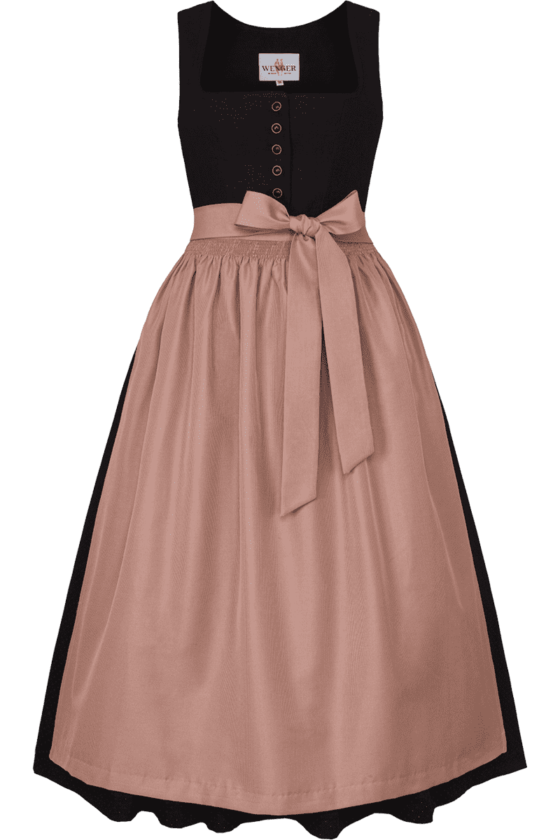 Das lange Dirndl ELISA von Wenger ist sehr schlicht gehalten und eignet sich daher hervorragend für das Tragen in der Gastronomie, Hotellerie und als Vereinskleidung. Je nach Belieben kann eine dezente oder auffällige Schürze dazu kombiniert werden - so entsteht immer wieder ein neuer Look in Tracht.Das Mieder aus Leinen hat einen eckigen Ausschnitt und ist mit mehreren Paspeln verziert. Traditionell hat es Wiener Nähte. Vorne wird das Dirndl mit altsilbernen Knöpfen mit schwarzem Schmuckstein geschlossen. Auf der Rückseite ist ein Muster mit Paspel eingearbeitet.Der ca. 80 cm lange Rock hat auf der rechten Seite eine praktische Tasche. Der Oberstoff ist mit kleinen Pünktchen verziert. Die Baumwollqualität ist auch an warmen Tagen angenehm zu tragen und langlebig. Die rosafarbene Schürze aus festem Stoff rundet das Design ab und setzt einen farbigen Akzent.