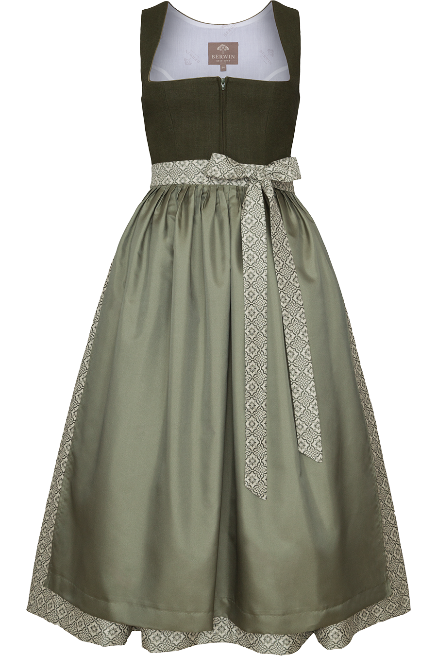 Dieses elegante Dirndl von Berwin begeistert mit einem liebevoll gestalteten Schößchen – ein besonderer Hingucker mit stilvoller Silhouette. Das schlicht gehaltene Mieder überzeugt durch seinen hohen Leinenanteil, die typische Leinenstruktur und den eckigen Ausschnitt, der mit einer tonigen Paspel eingefasst ist. Wiener Nähte sorgen für eine feminine Passform, das komplett gefütterte Innenfutter bietet optimalen Tragekomfort.