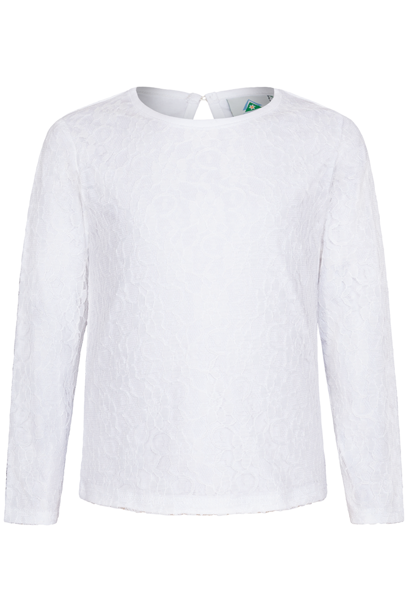 Dieses hochwertige Trachtenshirt aus reiner Baumwolle ist ein vielseitiges Must-have im Kleiderschrank eines Madls. Angenehm zu tragen, lässt es sich ideal mit einem süßen Trachtenrock kombinieren oder statt der klassischen Dirndlbluse unter dem Dirndl tragen. Der feine Spitzenstoff mit floralem Muster verleiht dem Shirt einen niedlichen und zeitlosen Look. Auf der Rückseite sorgt ein Tropfenausschnitt, der mit einem perlmuttfarbenen Knopf geschlossen wird, für eine praktische und stilvolle Note.In der Größe 116 ist das Oberteil ca. 40 cm lang.