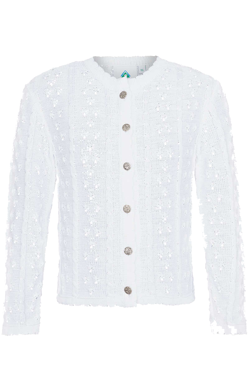 Eine zarte Langarm-Strickjacke in Weiss für Mädchen. Die links gestrickte Jacke ist an Ärmel und Bund mit gestricktem Mausezähnchenmuster verziert. Zöpfe und Ajourmuster wechseln sich harmonisch ab. Runde Metallknöpfe mit Blumenmuster unterstreichen den mädchenhaften Charme der Jacke. Die Jacke aus 50 % Baumwolle und 50 % Polyacryl ist sehr angenehm zu tragen. Sie lässt sich zu jedem Dirndl kombinieren, besonders festlich auch zu Taufdirndl, Kommunionsdirndl und für Blumenmädchen.