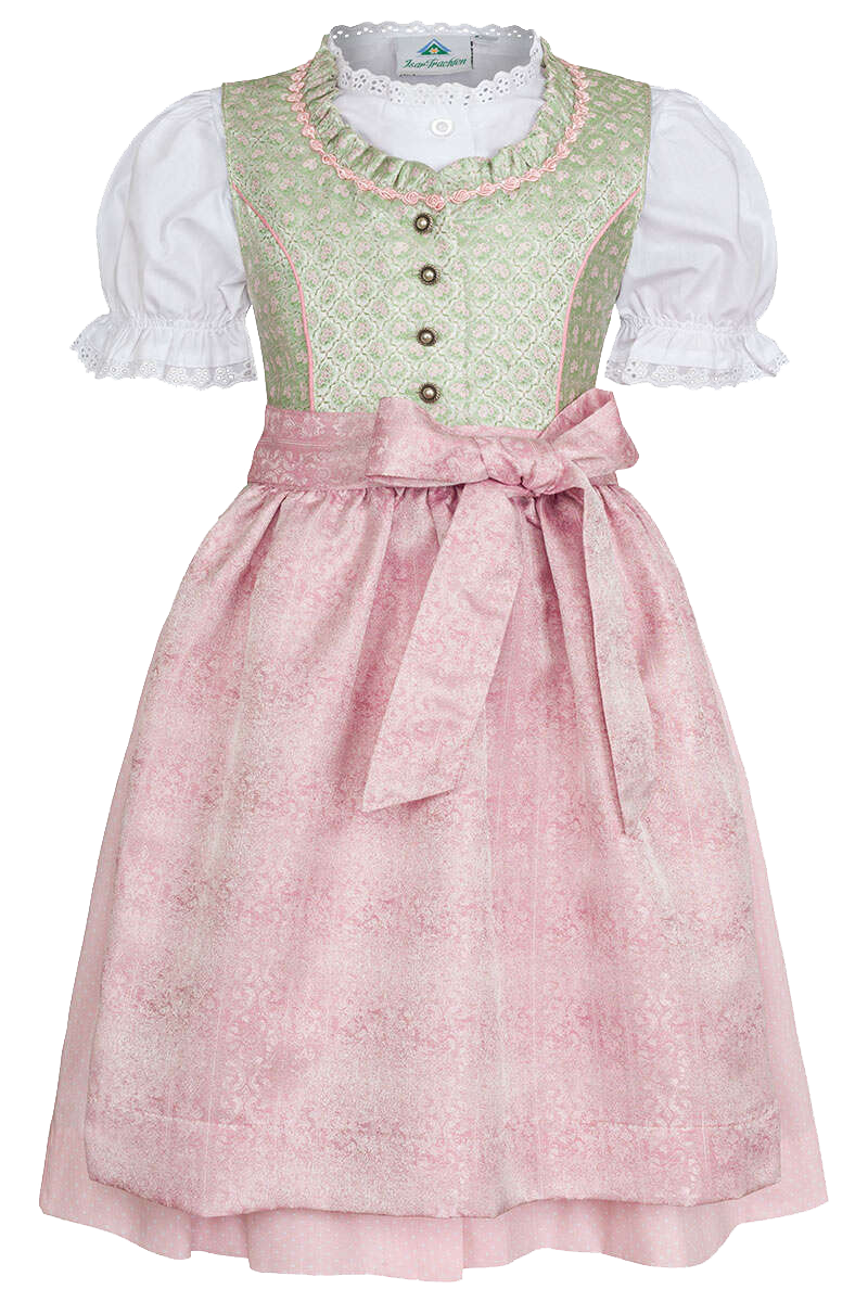 Dieses wunderschöne Kinder-Dirndl der Marke Isar-Trachten ist inklusive Bluse in den zarten Pastelltönen rosa und hellgrün gefertigt und zaubert aus Ihrer kleinen Maus schon in ganz jungen Jahren ein richtig fesches Trachten-Madl.Die hochwertigen Verzierungen aus Borte rund um den Halssaum, die traditionellen altsilbernen Knöpfen und schicken rosa Paspeln entlang des Brustabnähers zeigen schon auf den ersten Blick die hochwertige Verarbeitungsqualität dieses Dirndls. Das Oberteil und die Schürze sind sogar aus echtem Jacquard-Stoff gewebt und zeigen daher ein durch die Webart changierendes Muster. Der Rock besteht aus reiner Baumwolle und somit reiner Naturfaser.Ganz bestimmt wird Ihnen das Herz aufgehen, wenn Sie Ihre Tochter oder Ihr Enkelchen in diesem schicken Dirndl sehen - schon ganz wie die Großen.Auch zum Oktoberfest gibt es sicher kaum ein Dirndl, in dem Ihr Mädchen hübscher aussieht als in diesem.