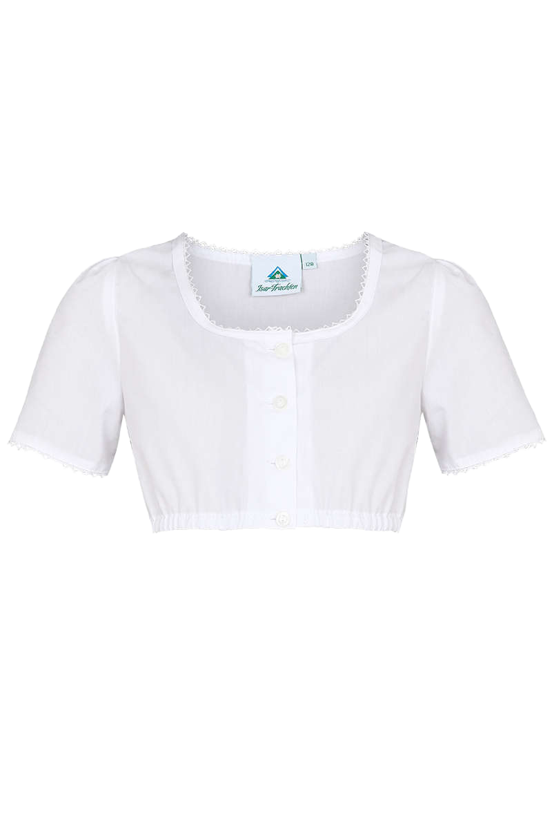 Die weiße Kurzarmbluse ist die ideale Ergänzung zum Dirndl für junge Trachtlerinnen. Der runde Halsausschnitt ist mit einer schlanken Spitzenborte besetzt, ebenso wie der Abschluss der Ärmel. Geschlossen wird sie mit einer weißen Knopfleiste. Das pflegeleichte Baumwollmischgewebe steht für einen angenehmen Tragekomfort.