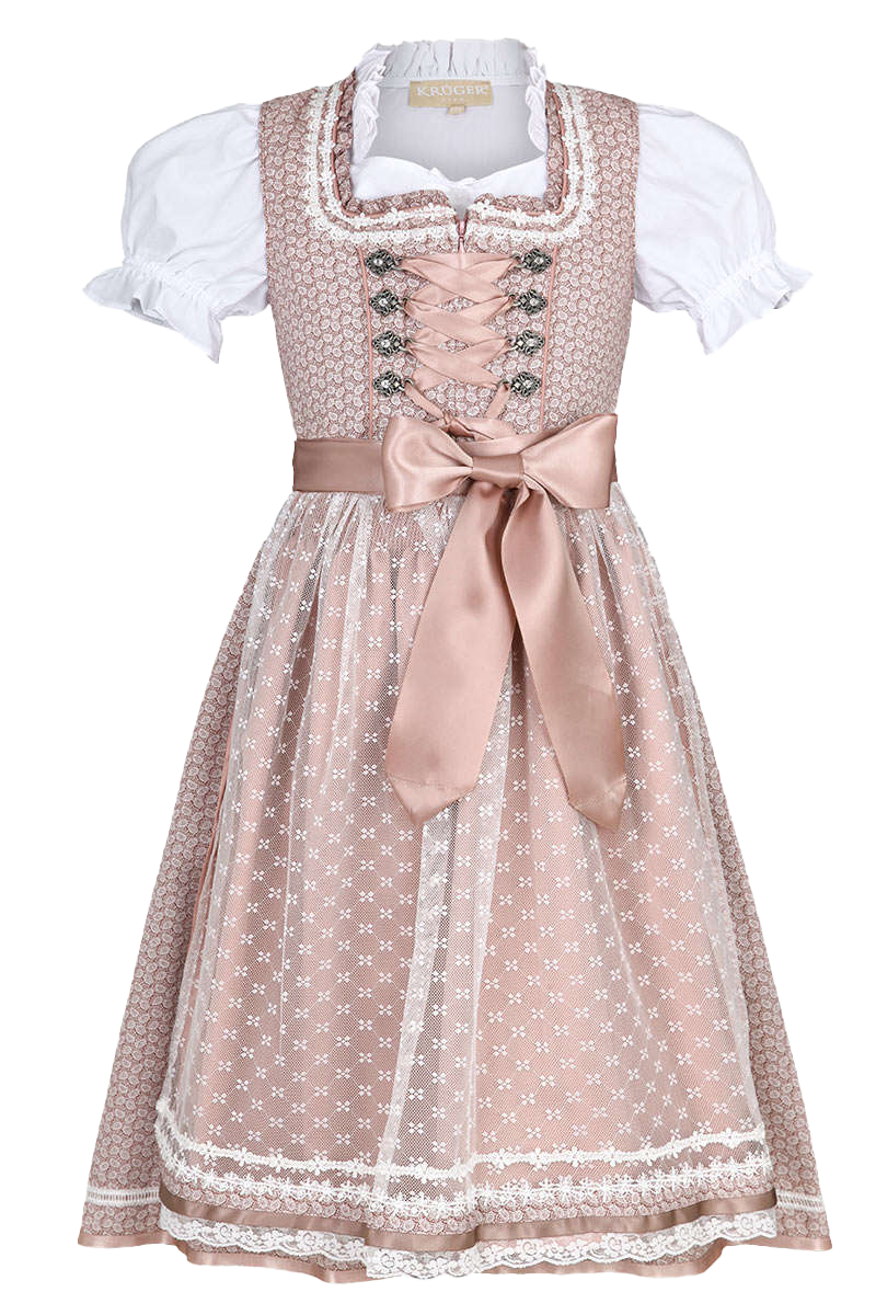 Ein zauberhaftes Dirndl in Altrosa für Mädchen von Krüger Kids. Das Dirndl ist komplett mit Schürze und Bluse ausgestattet, die auf den Ausschnitt des Mieders abgestimmt ist. Die Miederschnürung ist in Metallhaken mit Glitzersteinen gehalten. Die weiße, durchsichtige Spitzenschürze ist mit einem Satinfutter in Altrosa unterlegt. In der Größe 128 beträgt die Rocklänge circa 53 cm. Perfekt für Kommunion, Hochzeiten als Blumenmädchen, Einschulung.Zu diesem Dirndl ist das passende Dirndl für die Damen erhältlich.