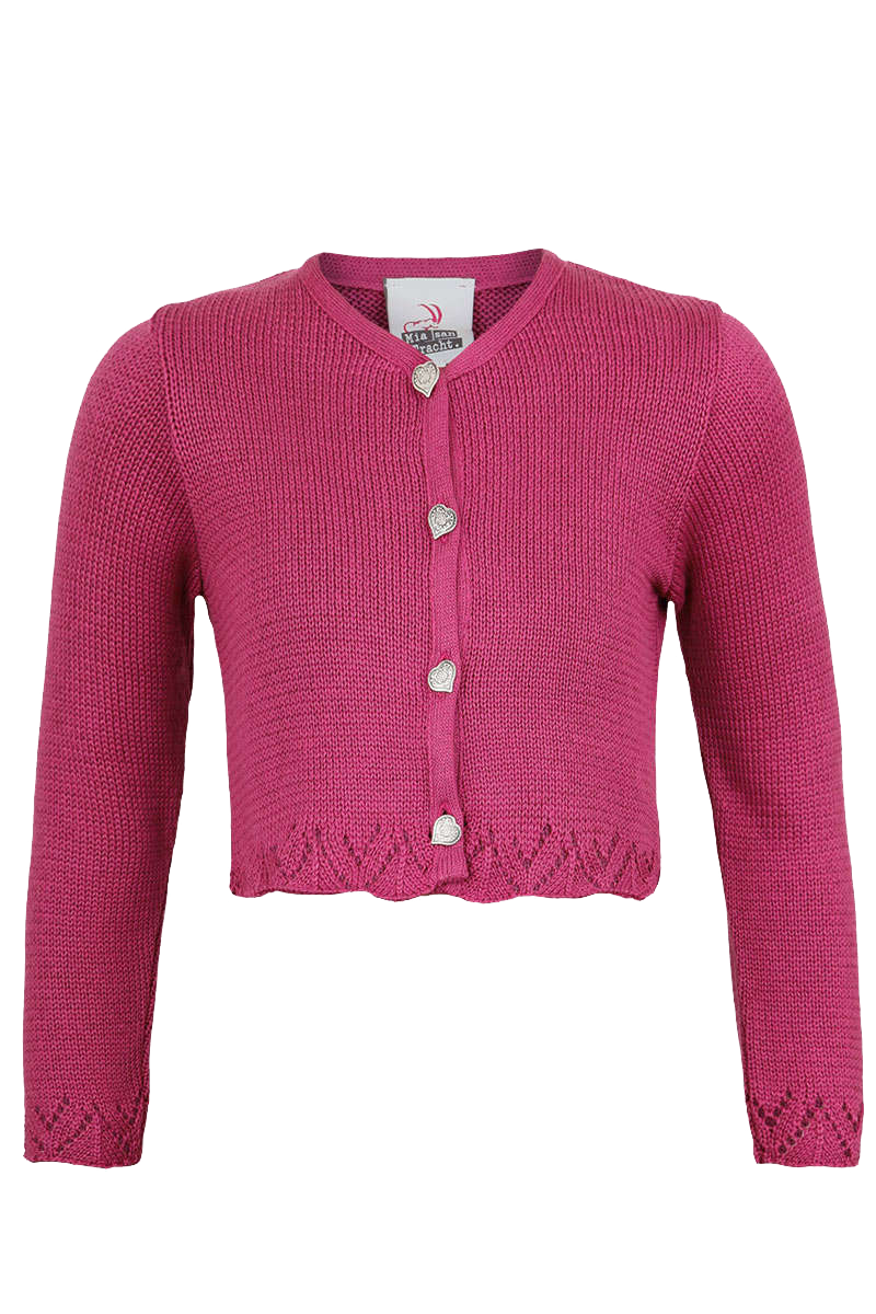 Eine festliche Langarm-Strickjacke in Pink für Mädchen. Die glatt gestrickte Jacke ist an Ärmel und Bund sind mit gestricktem Spitzenabschluss verziert. Metallknöpfe in Herzform unterstreichen den mädchenhaften Charme der Weste. Die Jacke aus 50 % Baumwolle und 50 % Polyacryl ist sehr angenehm zu tragen und lässt sich sowohl mit einem Dirndl als auch mit einer Hose kombinieren.