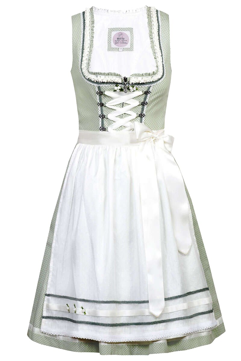 RICARDA von Marjo ist ein traditionell anmutendes Mini-Dirndl mit vielen verspielten Details in salbei (grün). Diese Details sind zum Beispiel Rüschen und Borten entlang der Miedernähte und des Ausschnitts, ein schön verzierter Reißverschluss-Zipp und aufgenähte Stoffrosen. Die Schürze ist aus einem transparenten Tüpfchenstoff in weiss gefertigt und in Saumnähe liebevoll verziert.
