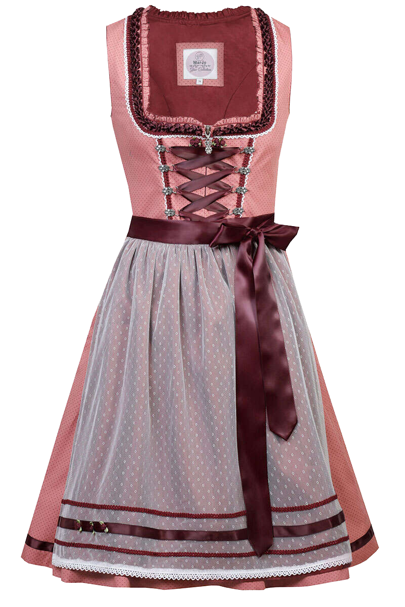 RICARDA von Marjo ist ein traditionell anmutendes Mini-Dirndl mit vielen verspielten Details in hagebutte (rosa). Diese Details sind zum Beispiel Rüschen und Borten entlang der Miedernähte und des Ausschnitts, ein schön verzierter Reißverschluss-Zipp und aufgenähte Stoffrosen. Die Schürze ist aus einem transparenten Tüpfchenstoff in weiss gefertigt und in Saumnähe liebevoll verziert.