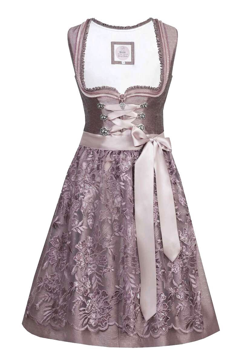 Das stilvolle Mini-Dirndl NADINA von MarJo verzaubert durch die romantische Farbkombination in Aubergine. Das Muster auf Oberteil und Rock ist sehr fein in das schimmernde Obermaterial eingearbeitet und hebt sich durch den leicht dunkleren Farbton ab. Der herzförmige Ausschnitt, der mit Borte und Rüschen geschmückt ist, betont das Dekolleté auf elegante Weise. Die Metallösen der Miederschnürung sind aufwendig in Blütenform gestaltet und mit zierlichen Glitzersteinen besetzt. Zudem gibt es ein edles gleichfarbiges Satinband zum Schnüren. Das Dirndl wird mit einem Reißverschluss auf der Vorderseite geschlossen, der durch die Miederschnürung verdeckt wird. Die violette Schürze ist aus transparentem Tüll und mit Blumen bestickt. Das Schurzband in Satinoptik wirkt neben den funkelnden Pailletten auf der Schürze besonders elegant.Das Dirndl eignet sich hervorragend für festliche Anlässe, da das Design und die Verarbeitung sehr hochwertig sind. Bei der Konfektionsgröße 36 beträgt die Rocklänge ca. 58 cm.