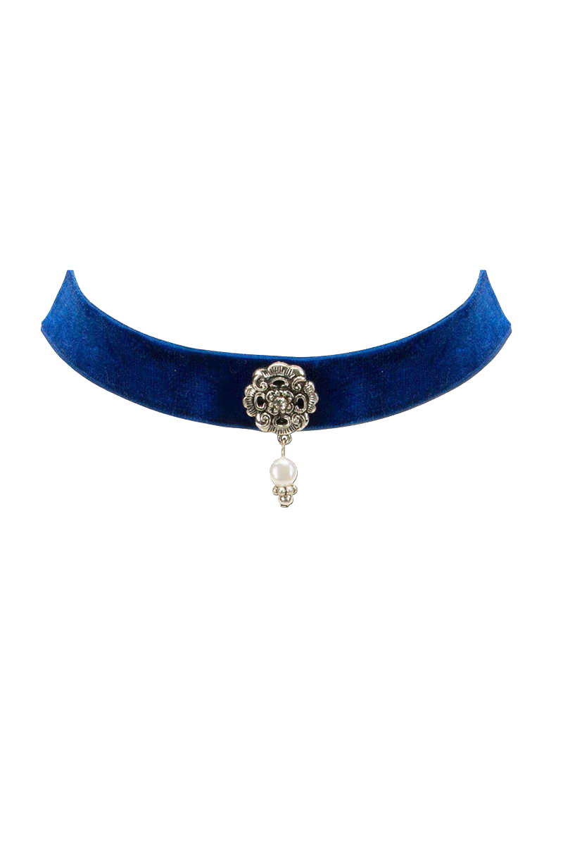 Trachtenschmuck Samtkropfband blauDieses süße Kropfband rundet Ihr Trachtenoutfit harmonisch ab. Das Kropfband ist Blau und in der Mitte mit einem aufwendig gestalteten Metallornament geziert. An dem Metallornament ist eine kleine weiße Perle angebracht. Das Samtband ist elastisch, was Ihnen einen hohen Tragekomfort bietet und sich schön an Ihren Hals anschmiegt. Die Länge des Bandes beträgt ca. 30 cm und kann um zusätzliche 7cm durch Verstellung verlängert werden.Die Kette wird von Hand gefertigt.