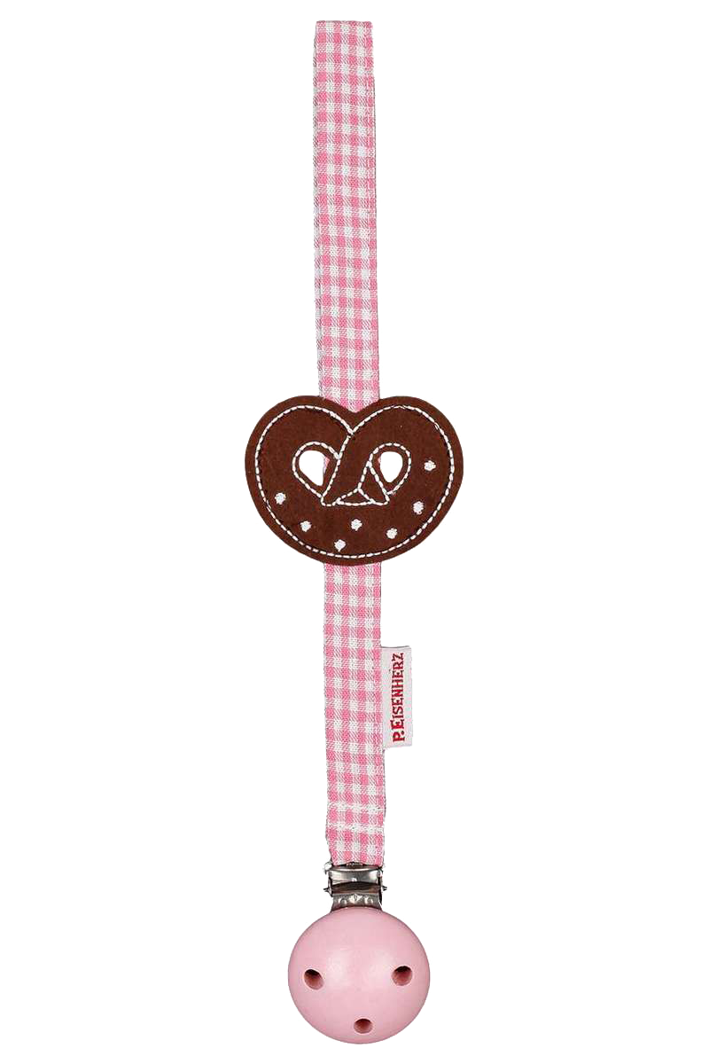 Dieses süße Schnullerband ist für jeden kleinen Trachtenfan ein Muss. Das Band ist aus rosa-weiß kariertem Stoff gearbeitet. Der Clip ist in rosa gehalten. In der Mitte des Bandes ist eine Brezn aus Filz angebracht. Ab der Brezn ist das Band doppellagig gearbeitet, so dass man es am Schnuller befestigen kann.