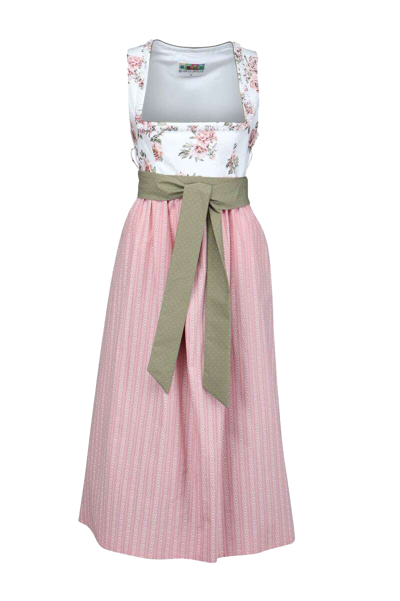 Ein romantisch langes Umstandsdirndl von Berwin & Wolff für werdene Mamas, dass vor allem durch seine feminine und verspielte Ausstrahlung überzeugt. Das liebliche Blumenmuster auf dem Oberteil ist in zarten Rosé- und Grüntönen gehalten. Ein zusätzlicher Blickfang ist die Borte um den eckigen Ausschnitt, die aus dem gleichen Material gefertigt ist. Auch die grüne Paspel am Ausschnitt ist für das romantische Dirndl charakteristisch. Die Farbe der Blüten wird im Rock wiederholt, der zusätzlich mit einem zierlichen linearen Muster versehen ist. Anstelle einer klassischen Schürze dient ein grünes Band mit niedlichen weißen Punkten, welches zur Schleife gebunden wird. Das Dirndl wird mit einem seitlichen Reißverschluss geschlossen. Bei einer Größe 36 beträgt die Rocklänge ca. 83 cm.Dieses Dirndl wurde ausschließlich in der EU produziert.