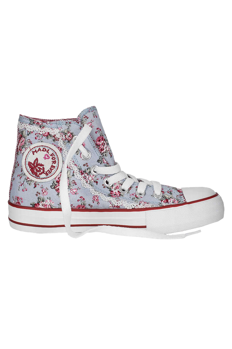 DER Trend für fesche Madln! Warum noch in unbequemen Pumps auf der Bierbank tanzen, wenn es auch bequem, aber trotzdem stylisch geht?Dieser Trachtensneaker im Chucks-Look ist einfach unerlässlich. Der Sneaker ist cool und bequem zugleich. Das tolle Blumenmuster kommt auf dem hellblauen Stoff gut zur Geltung. Die angebrachte weiße Spitzenbordüre rundet das Bild harmonisch ab. Das Weiß findet sich auch in der Kappe des Schuhs und in der Sohle wieder. An der Außenseite des Sneaker ist ein großes Emblem angebracht. Darauf ist eine rote Rose eingestickt und der Schriftzug „Madl forever", sowie ein kleines pinkes Herz. Die Schuhoberkante kann umgeklappt werden. Dadurch kommt das fesche weinrot-karierte Innenfutter zum Vorschein.Der Schuh verfügt über schlichte weiße und über dunkelrote Wechselschnürrsenkel.Der Sneaker kann sowohl zum Dirndl, als auch zur Jeans kombiniert werden und kann Sie so in nahezu allen Lebenslagen begleiten.