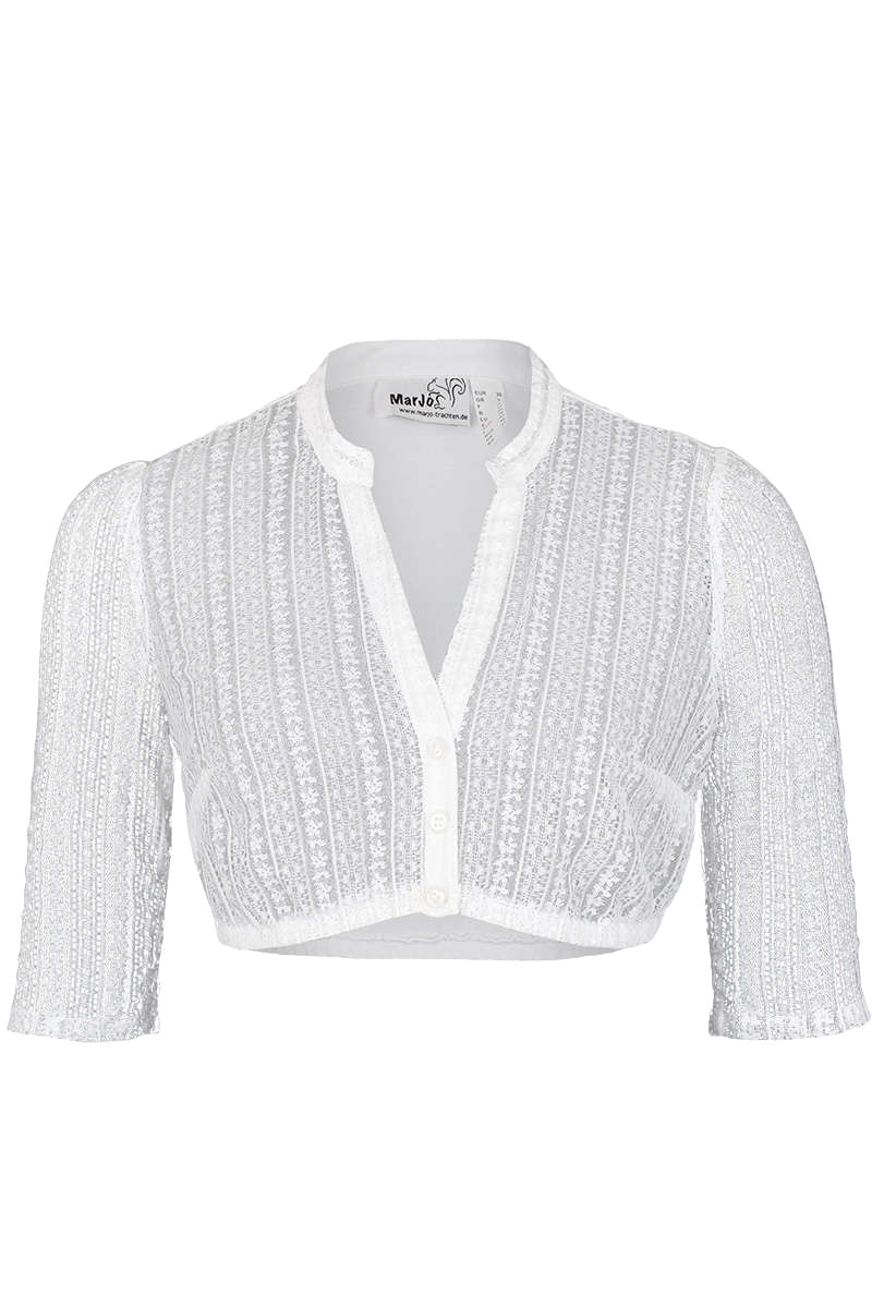 Diese fesche Dirndlbluse der Marke MarJo ist mit einem V-Ausschnitt und einem Stehkragen versehen. Der Körper der Bluse und die Dreiviertel-Ärmel sind komplett aus Spitze gearbeitet. Am Saum der Bluse ist ein Gummizug angebracht. Geschlossen wird die Bluse mit drei Knöpfen in Perlmuttoptik. Der Rücken der Bluse ist schlicht gehalten.