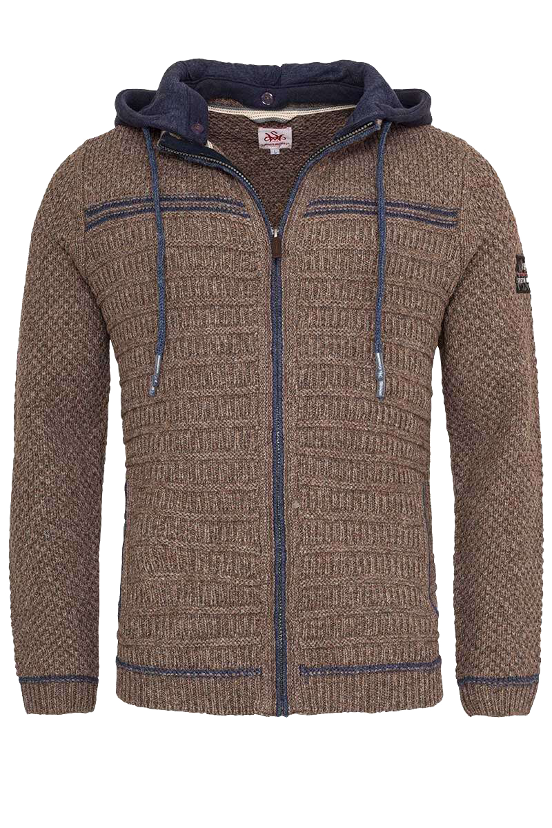 TOMEK ist eine beigebrauen Herrenstrickjacke, die mit viel Liebe zum Detail aus verschiedenen sich abwechselnden aufwendigen Strickmustern gefertigt ist. Die abknöpfbare Kapuze setzt sich farblich ab und ist aus dunkelblauem Sweatstoff gefertigt, genau wie die modischen Ellenbogen-Aufnäher, was einen angesagten Materialmix-Effekt erzeugt. Auch dünne Streifen an den Ärmelabschlüssen und am Bund, sowie die Reißverschlusseinfassung, heben sich in der dunkelblauen Kontrastfarbe ab. Noch einmal aufgegriffen wird der Farbton von zwei eingestrickten Streifen, die quer über die Brust verlaufen und den lässigen Look der Jacke vervollständigen.Auf dem linken Oberarm ist ein Markenpatch angebracht.Die Jacke besitzt zwei praktische Einschubtaschen und wird vorne mit einem Reißverschluss geschlossen.
