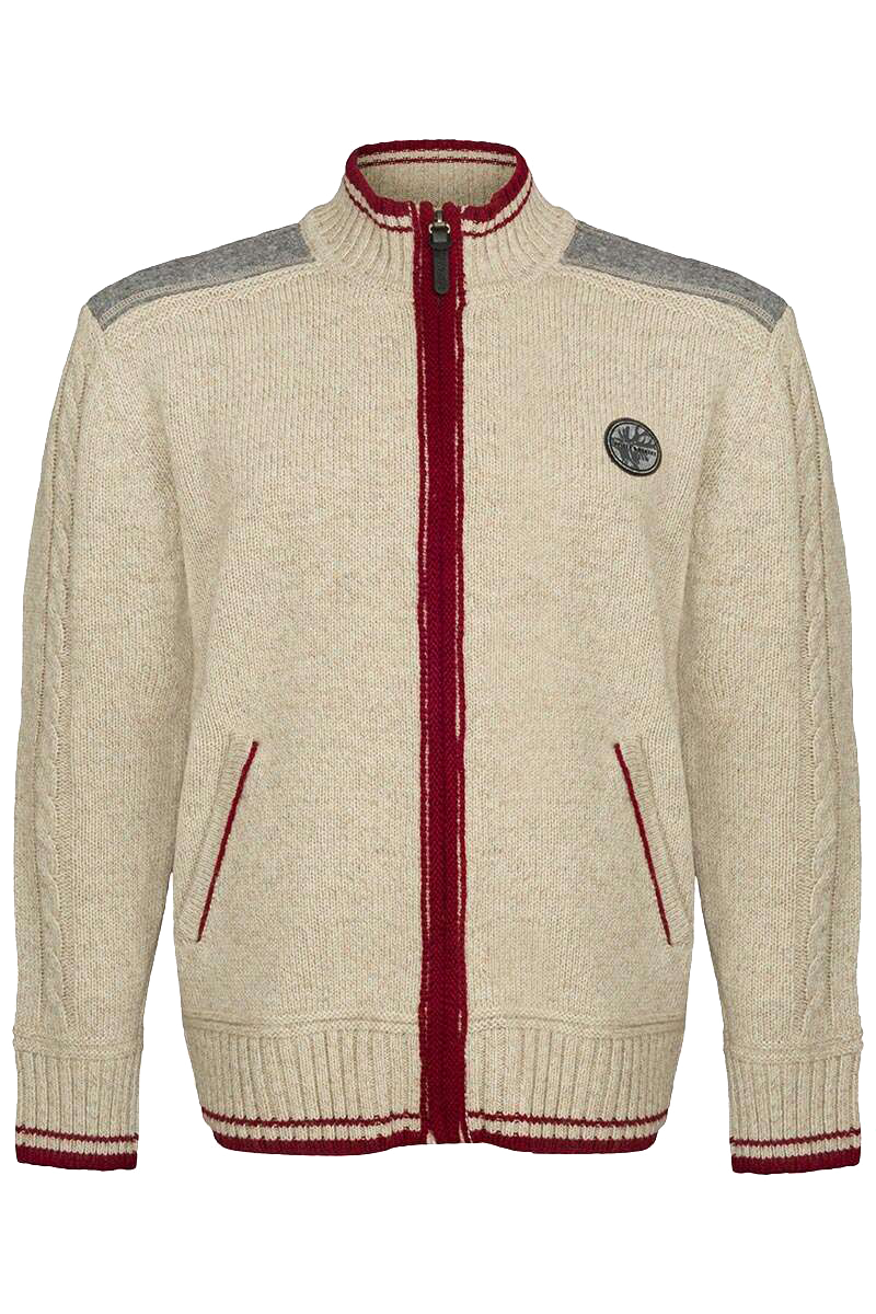 Diese schicke naturfarbene Herren-Strickjacke der Marke Spieth & Wensky ist aus 60% Schurwolle gefertigt und daher aus traditionell hochwertiger Qualität.Die Schaf-Schurwolle sorgt für besonders hohe Atmungsaktivität, angenehme Wärme an kühlen Abenden und höchsten Tragekomfort gleichzeitig.Der Clou sind die schicken dunkelroten Verzierungen entlang des Reißverschlusses sowie an Hals- und Hüftbündchen, kombiniert mit den hellblauen Einsätzen aus reiner, 100%iger Schafschurwolle an den Schultern und Ellenbogen.Diese Strickjacke lässt sich zur Jeans wunderbar kombinieren, kann aber als Trachten-Strickjacke ebenso zur Trachtenhose punkten. Auch im Büro machen Sie damit immer einen gepflegten, schicken Eindruck.Und nun: Nichts wie auf zum Oktoberfest! Viel Spaß!