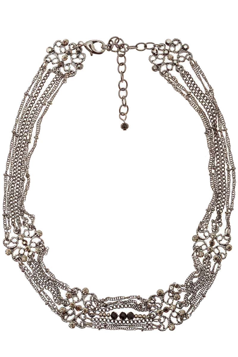 Ein romantisch verspieltes Kropfband aus filigranen Gliederketten in sechslagiger Ausführung. Die Ketten werden sechsmal unterbrochen von Gliederelementen, die mit Glitzersteinen besetzt sind. Am Karabinerverschluss kann das Band über eine 7 cm lange Gliederkette in der Länge variabel eingestellt werden. Das Kropfband ist in den Farben Silber, Altsilber und Altgold erhältlich.