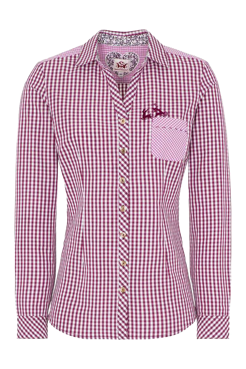 Die Damenbluse Mallorca von Spieth & Wensky hat mit ihrem weiß/beerefarbenem Karo einen besonders rustikalen Touch. Die Knopfleiste beginnt unterhalb eines kurzen V-Ausschnittes und ist mit Knöpfen in Hornoptik gefertigt. Über der Brusttasche hat sie eine wunderschöne Stickerei mit zwei springenden Hirschen. Der Schnitt ist leicht tailliert und mit langen Ärmeln ausgeführt. Die Kragen- und Knopfleisten-Innenseite sind mit einem Stoff in feinem Blumenprint abgesetzt.