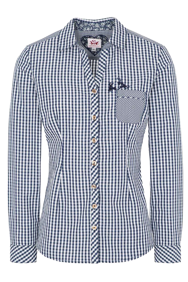 Die Damenbluse Mallorca von Spieth & Wensky hat mit ihrem weiß/blauen Karo einen besonders rustikalen Touch. Die Knopfleiste beginnt unterhalb eines kurzen V-Ausschnittes und ist mit Knöpfen in Hornoptik gefertigt. Über der Brusttasche hat sie eine wunderschöne Stickerei mit zwei springenden Hirschen. Der Schnitt ist leicht tailliert und mit langen Ärmeln ausgeführt. Die Kragen- und Knopfleisten-Innenseite sind mit einem Stoff in feinem Blumenprint abgesetzt.