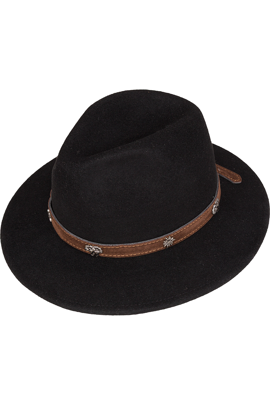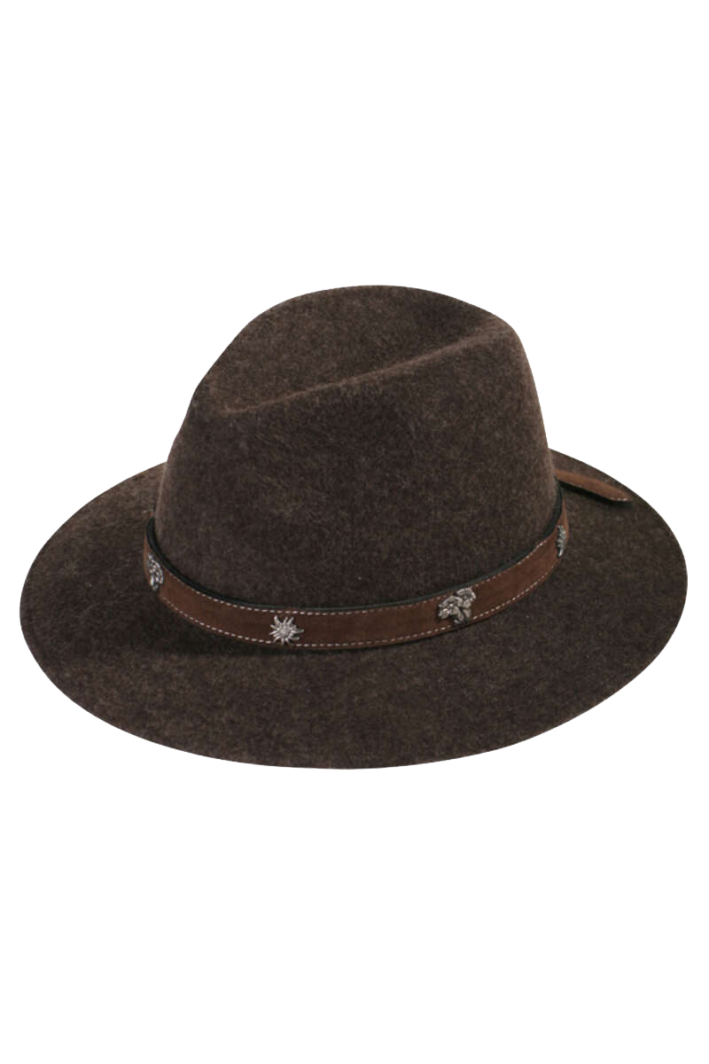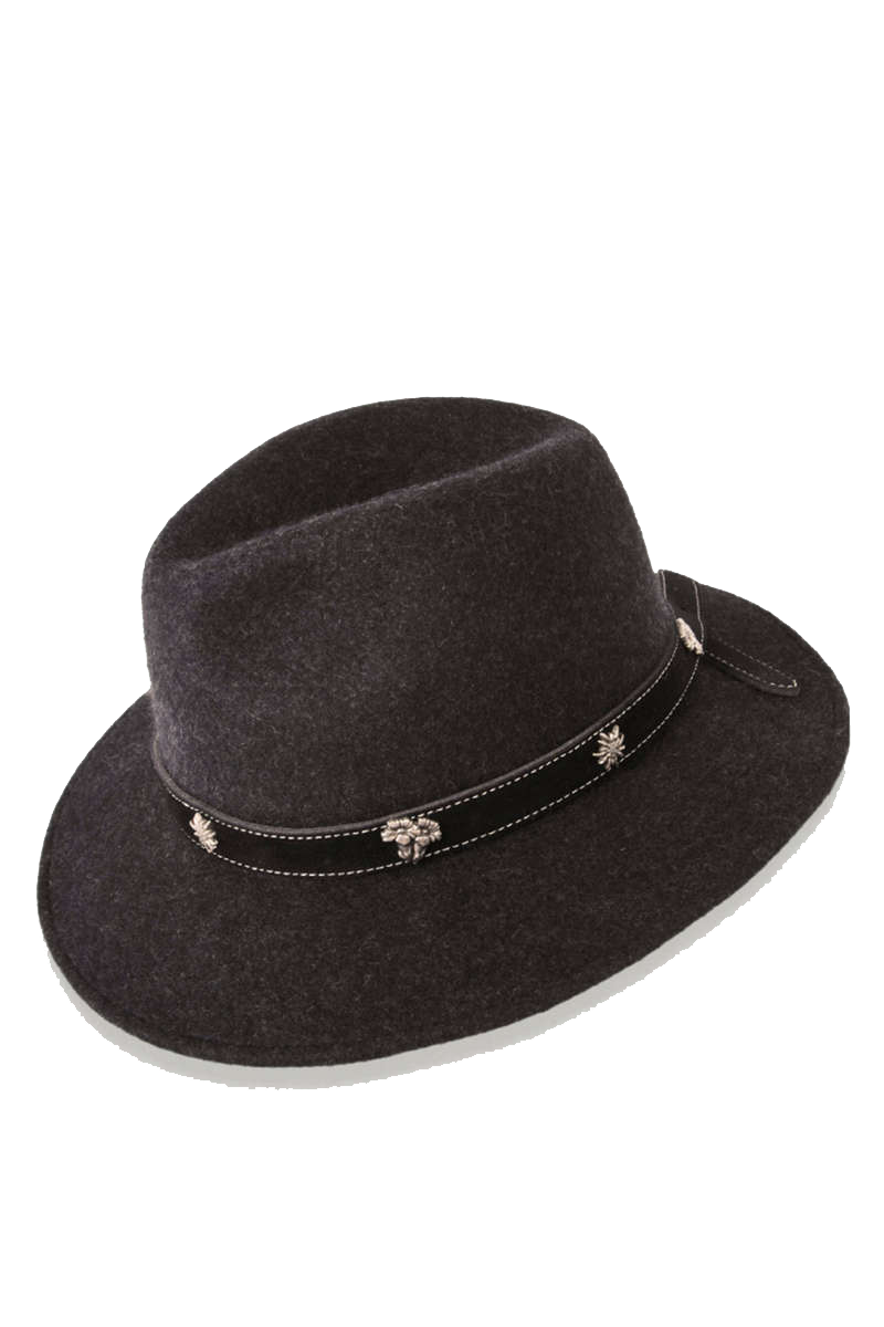 Die Hutgarnitur besteht aus einem Kunstlederband, das mit silberfarbenen Alpenblumen verziert ist – darunter klassisches Edelweiß und Enzian. So entsteht ein traditioneller Akzent, der dem Hut seine unverwechselbare Ausstrahlung verleiht.