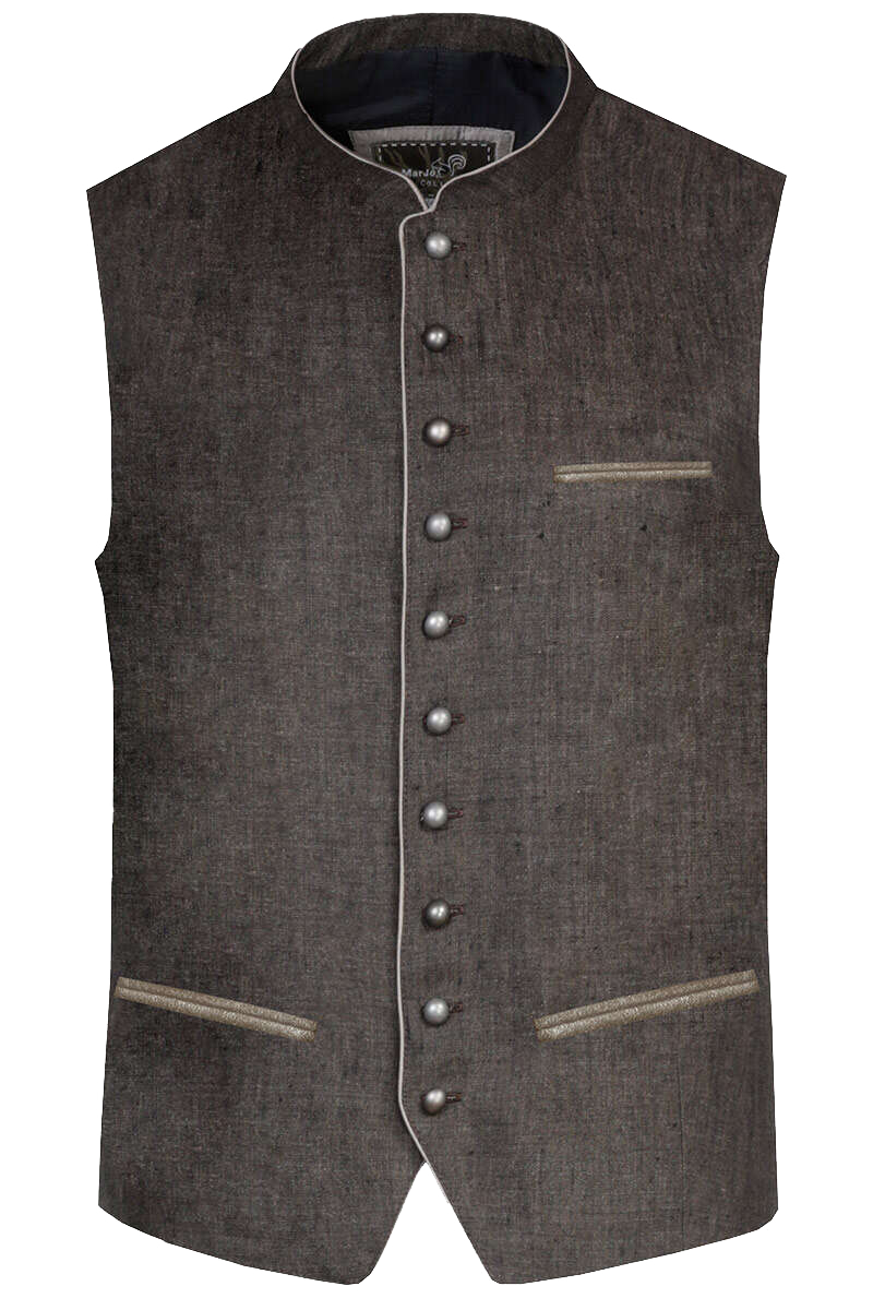 AUGUST von MarJo aus der Gents Collection ist eine edle Trachtenweste, die durch ihre melierte Optik besonders lässig wirkt. Die schlichte Farbe lässt sich wunderbar mit vielen Trachtenhemden und Sakkos kombinieren.Der dunkelbraune Oberstoff wird durch helle Details in Champagner an den Taschen und der Knopfleiste kontrastiert. Kugelknöpfe runden das Design ab. Besonders edel wirkt die Rückseite, die mit einem feinen Muster versehen ist und leicht schimmert. Die Weste ist klassisch mit zwei Vordertaschen und einer Brusttasche ausgestattet. Sie ist innen komplett gefüttert und hat auf der linken Seite eine weitere Tasche. Der Rücken ist mit einem Dragoner zur Weitenregulierung ausgestattet.Die Rückenlänge in Größe 50 beträgt 63 cm.