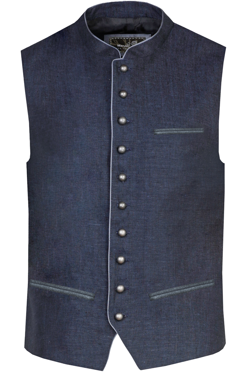 AUGUST von MarJo aus der Gents Collection ist eine edle Trachtenweste, die durch ihre melierte Optik besonders lässig wirkt. Die schlichte Farbe lässt sich wunderbar mit vielen Trachtenhemden und Sakkos kombinieren.Der dunkelblaue Oberstoff wird durch helle Details in der Farbe Silber an den Taschen und der Knopfleiste kontrastiert. Kugelknöpfe runden das Design ab. Besonders edel wirkt die Rückseite, die mit einem feinen Muster versehen ist und leicht schimmert. Die Weste ist klassisch mit zwei Vordertaschen und einer Brusttasche ausgestattet. Sie ist innen komplett gefüttert und hat auf der linken Seite eine weitere Tasche. Der Rücken ist mit einem Dragoner zur Weitenregulierung ausgestattet.Die Rückenlänge in Größe 50 beträgt 63 cm.