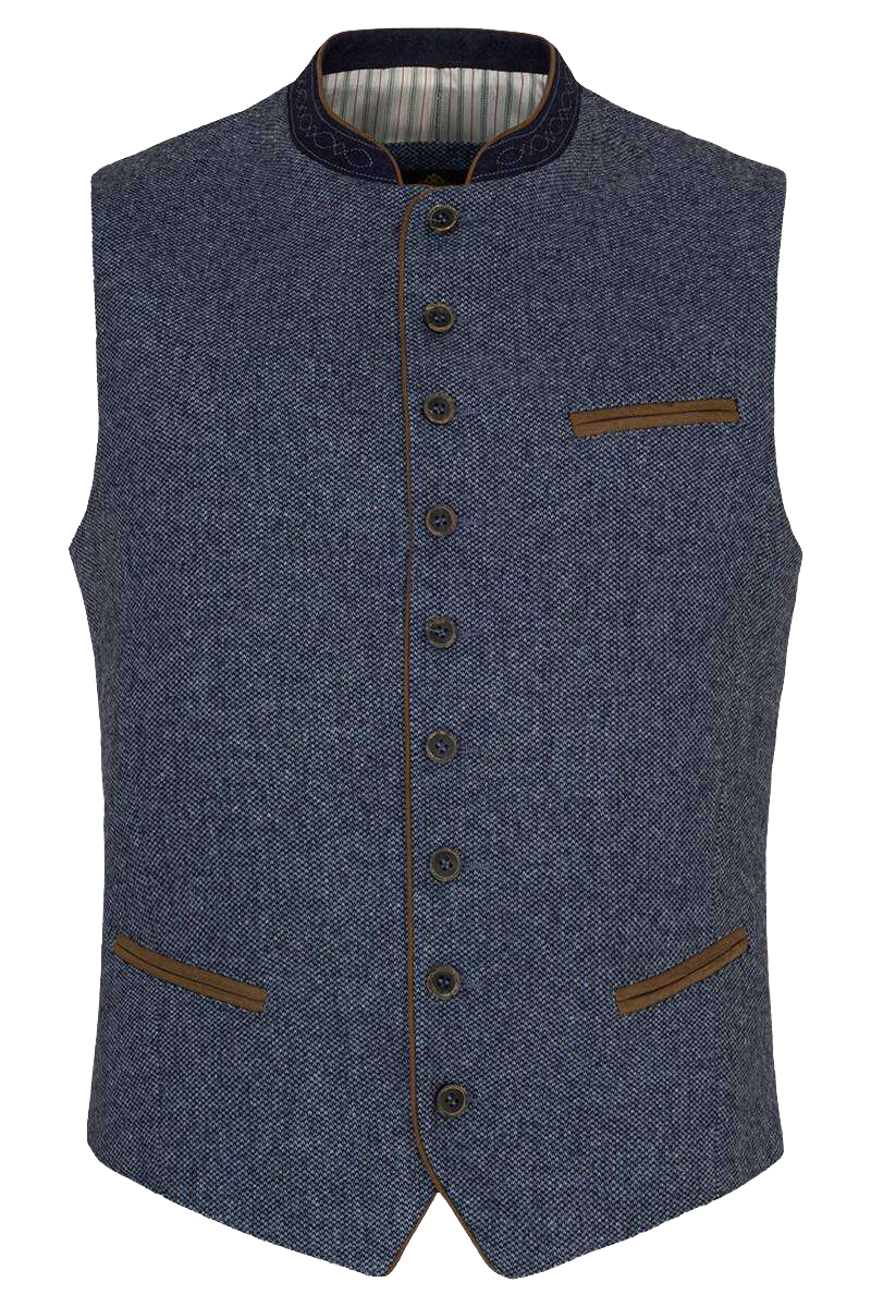 Die dunkelblaue Trachtenweste JONAS in Slim-Fit-Passform besticht durch ihre traditionelle Optik und rundet Ihren Trachtenauftritt ab. Die Vorderseite ist fein gemustert und hochwertig mit Wolle verarbeitet. Der dunkelblaue Stehkragen wirkt durch die feine Stickerei besonders edel. Weitere Akzente setzen die braunen Paspeln an den vorderen Taschen. Die braunen Knöpfe aus echtem Horn und die feine Paspelierung an der Knopfleiste runden das traditionelle, aber schicke Design ab.Die Weste ist klassisch mit zwei vorderen Einschubtaschen und einer Brusttasche ausgestattet. Sie ist innen komplett gefüttert und hat eine weitere Tasche auf der linken Seite. Der gestreifte Rücken ist mit einem Dragoner zur Weitenregulierung versehen.Die Rückenlänge in Größe 50 beträgt 60 cm.