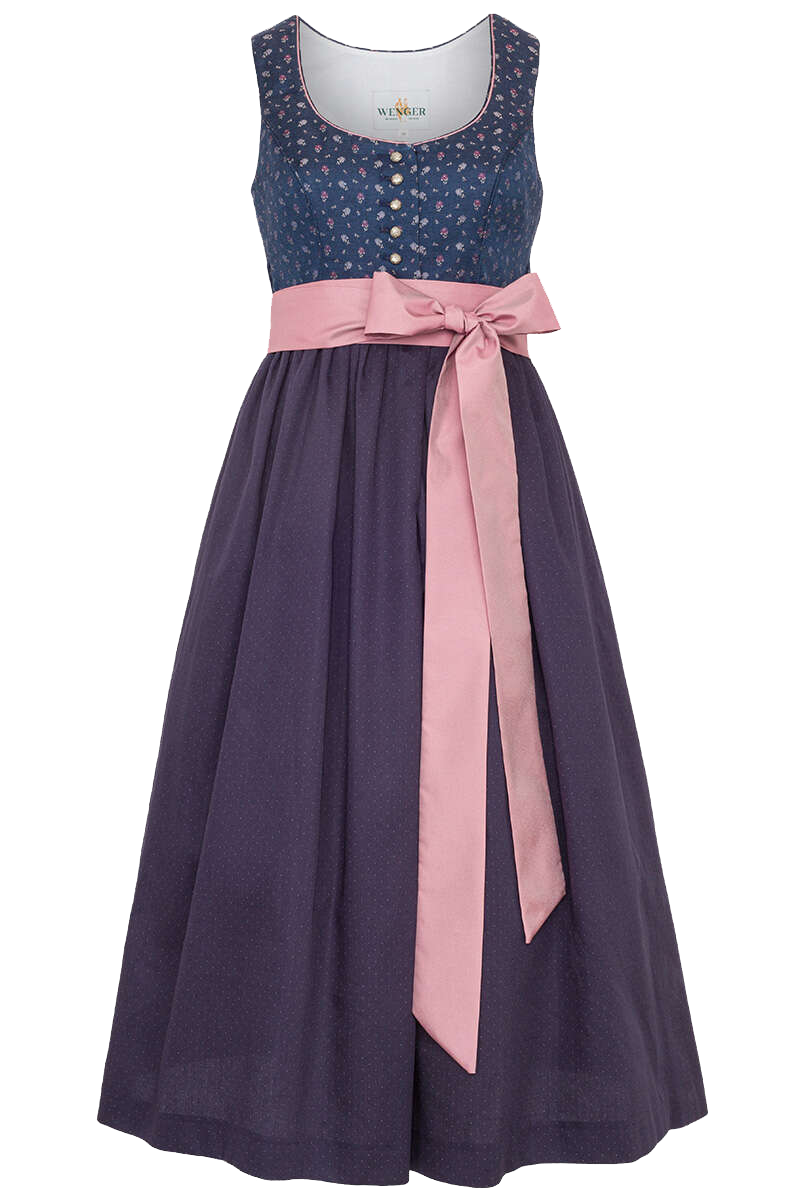Werdende Mamas aufgepasst: LINETTE von Wenger ist ein wunderschönes marineblaues Umstands-Dirndl für festliche Anlässe mit viel Platz für euren wachsenden Babybauch!Das hübsche Mieder mit kleinen rosa und beere-farbenen Blümchen besitzt einen runden Ausschnitt, um den ein dünnes rosanes Paspol verläuft. Geschlossen wird das Mieder vorne mit filigran gemusterten Kugelknöpfen aus Metall. Darunter schließt in kleine Falten gelegt der 80 cm lange dunkelblaue Dirndlrock mit feinem Punktmuster an.Hingucker: Anstelle einer traditionellen Schürze ziert das Kleid ein breites rosa Satinband, das vorne zur Schleife gebunden wird.Das Innenfutter im Mieder aus reiner Baumwolle sorgt für einen hohen Tragekomfort.Die Dirndlbluse India 1043500 ist die genau passende Dirndlbluse zum Dirndl. Es passen jedoch auch viele andere Dirndlblusen zu unseren Umstanddirndln.