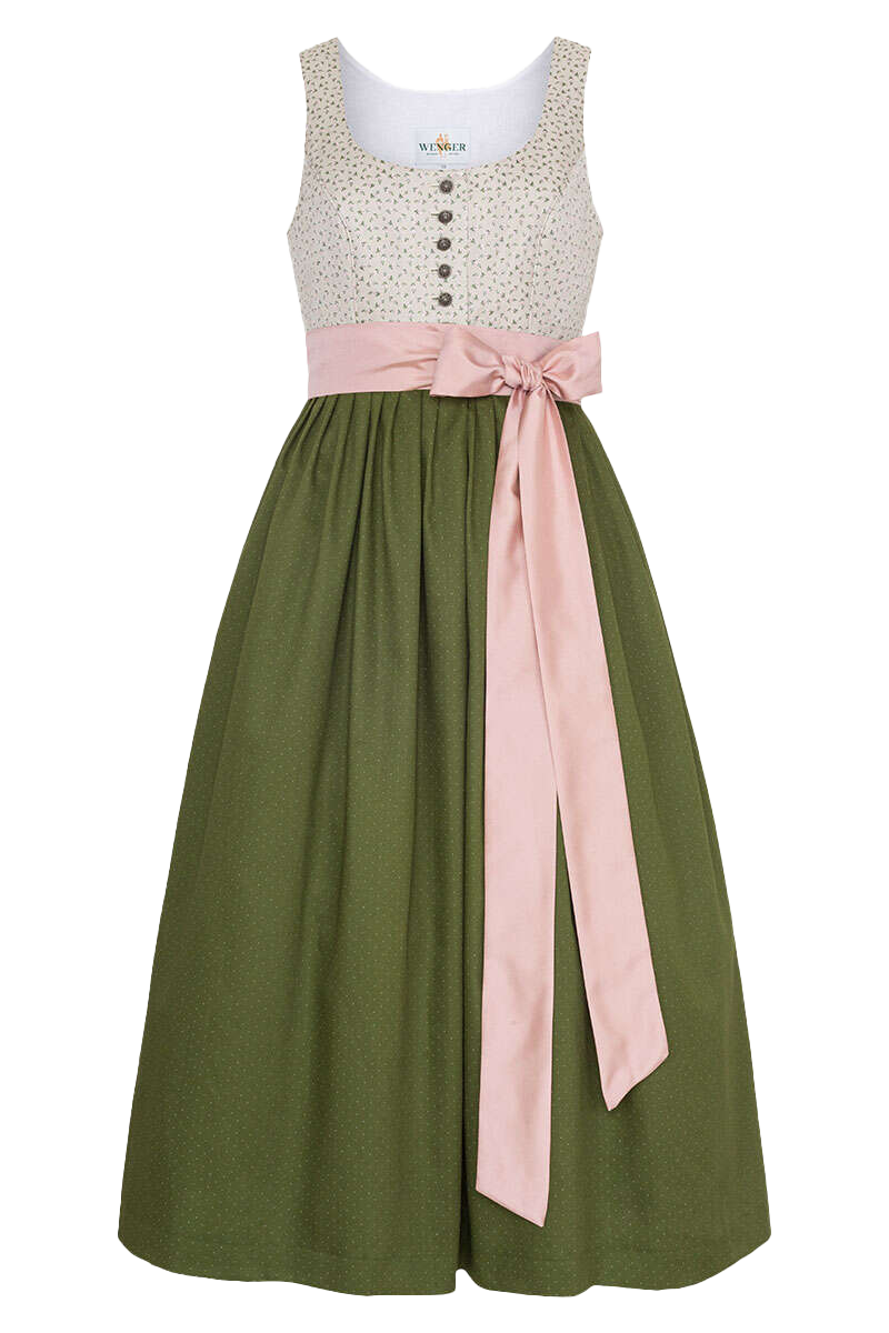 Das Umstandskleid VIVIAN von Wenger ist ein Hingucker für alle werdenden Mamas, indem der wachsende Babybauch genügend Platz findet und auch noch wunderschön zur Geltung kommt. Das Besondere: Anstelle einer traditionellen Schürze ziert das Kleid ein breites rosa Band, das vorne zur Schleife gebunden wird.Es kann sowohl zur standesamtlichen Hochzeit als auch zu vielen anderen festlichen Anlässen getragen werden. Das naturfarbene Mieder mit kleinen grün-rosa Blümchen besitzt einen runden Ausschnitt und ist ausgestattet mit so genannten Wiener Nähten. Geschlossen wird das Mieder vorne mit filigran gemusterten Kugelknöpfen aus Metall. Darunter schließt sich der 80 cm lange olivgrüne Dirndlrock mit feinem Punktmuster an.Das Innenfutter im Mieder aus reiner Baumwolle sorgt für einen hohen Tragekomfort.Die Dirndlbluse India 1043500 ist die genau passende Dirndlbluse zum Dirndl. Es passen jedoch auch viele andere Dirndlblusen zu unseren Umstanddirndln.
